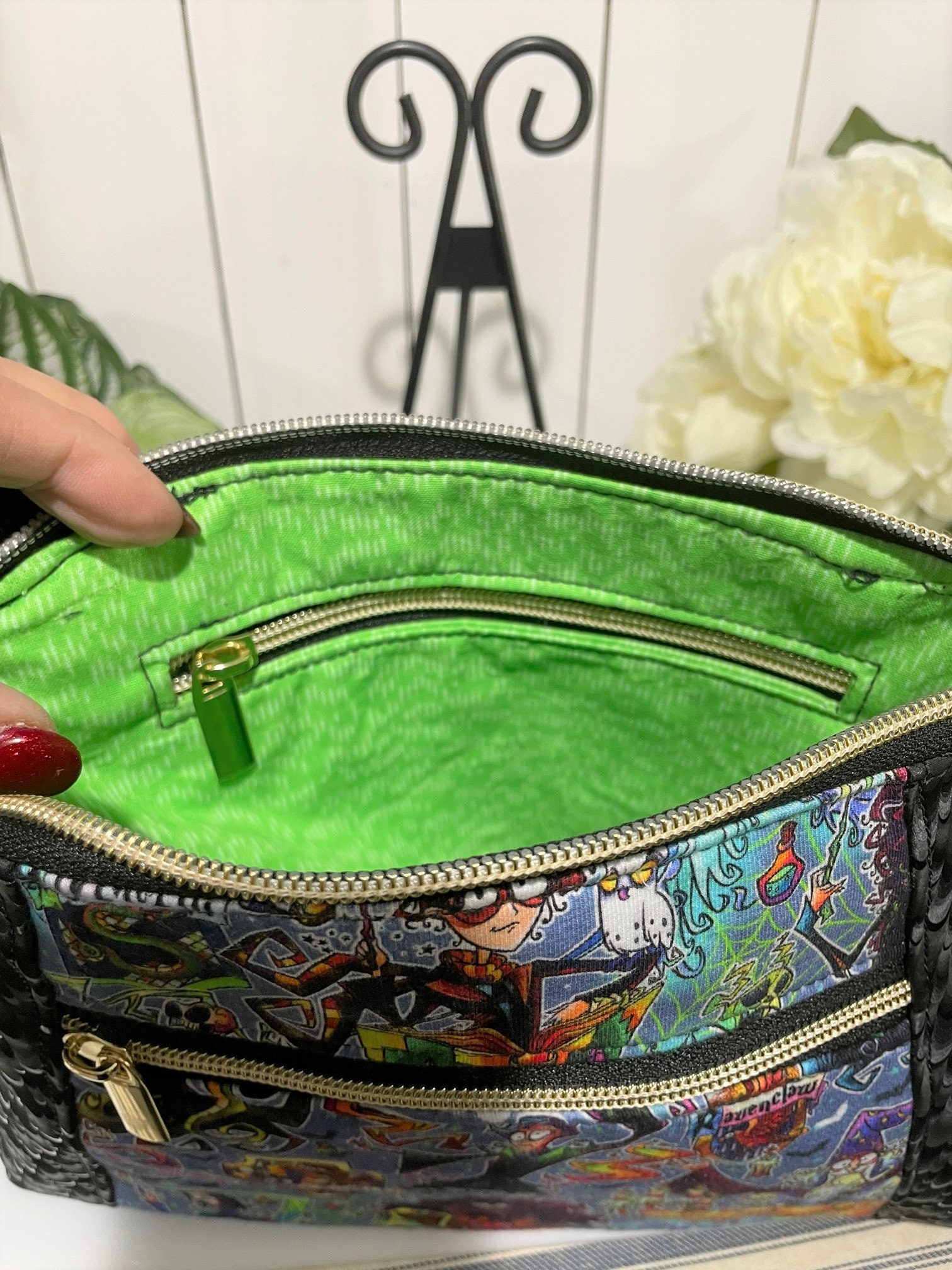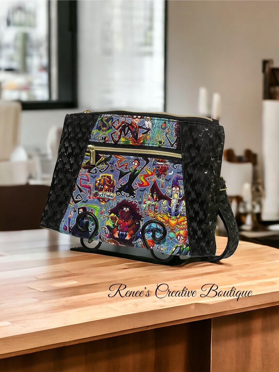 This HP purse is designed with HP licensed Cotton Lycra and Black Vinyl exterior and an exterior pocket. The interior cotton lining includes one zipper pocket.