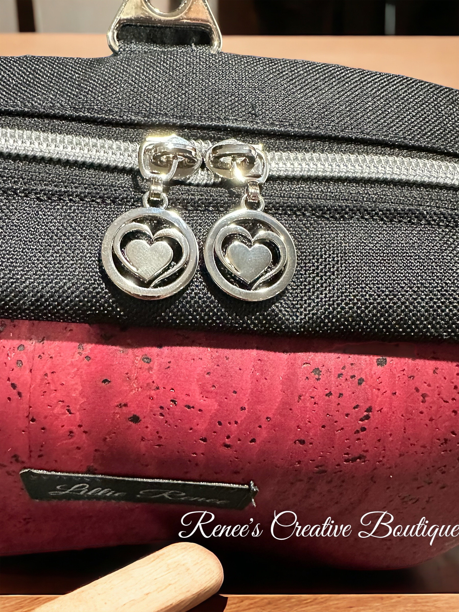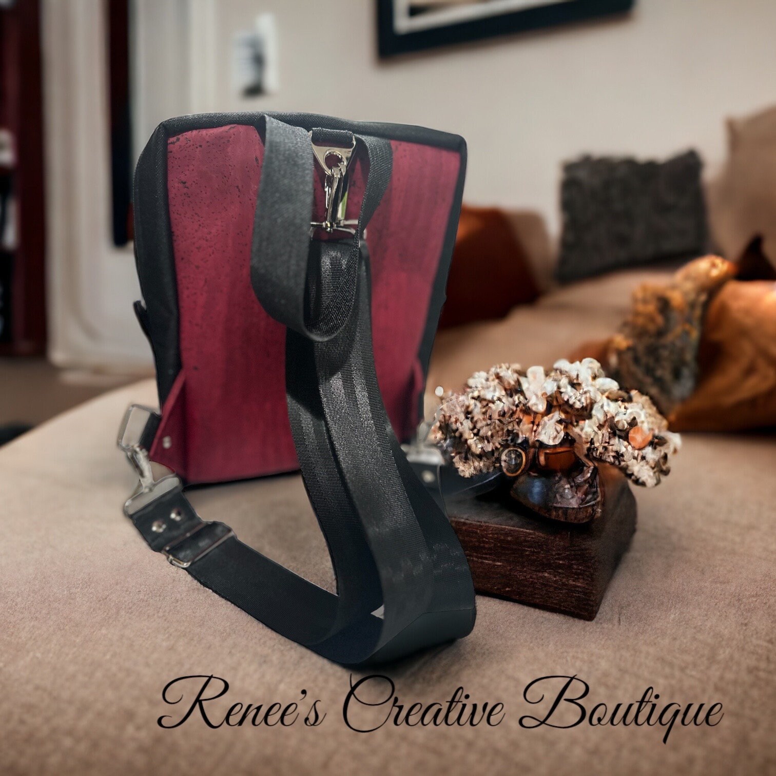 This Making Backpack is designed in Wine cork, silver cork with black butterflies and black waterproof canvas. It measures 10" x 12" with adjustable straps.