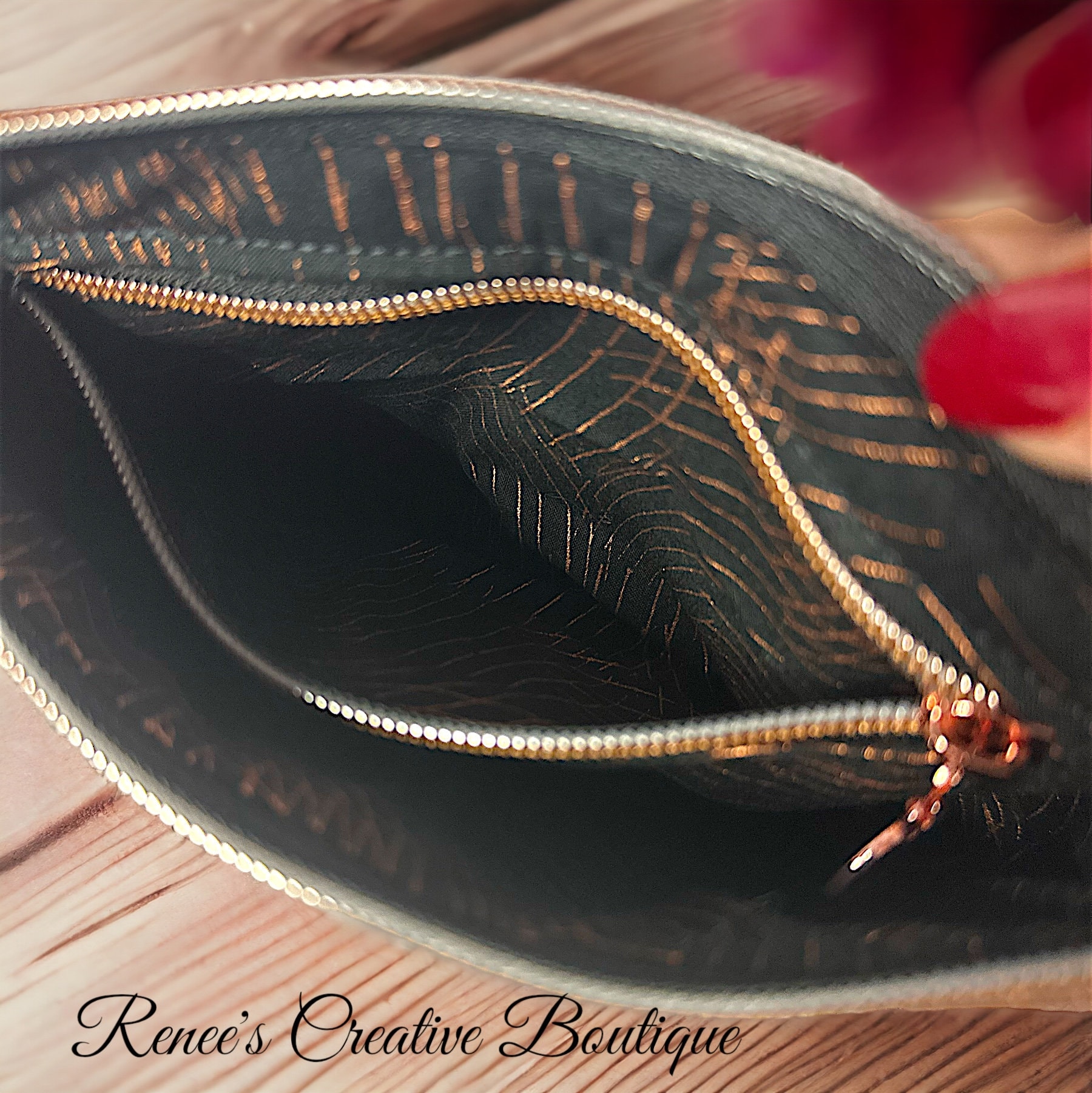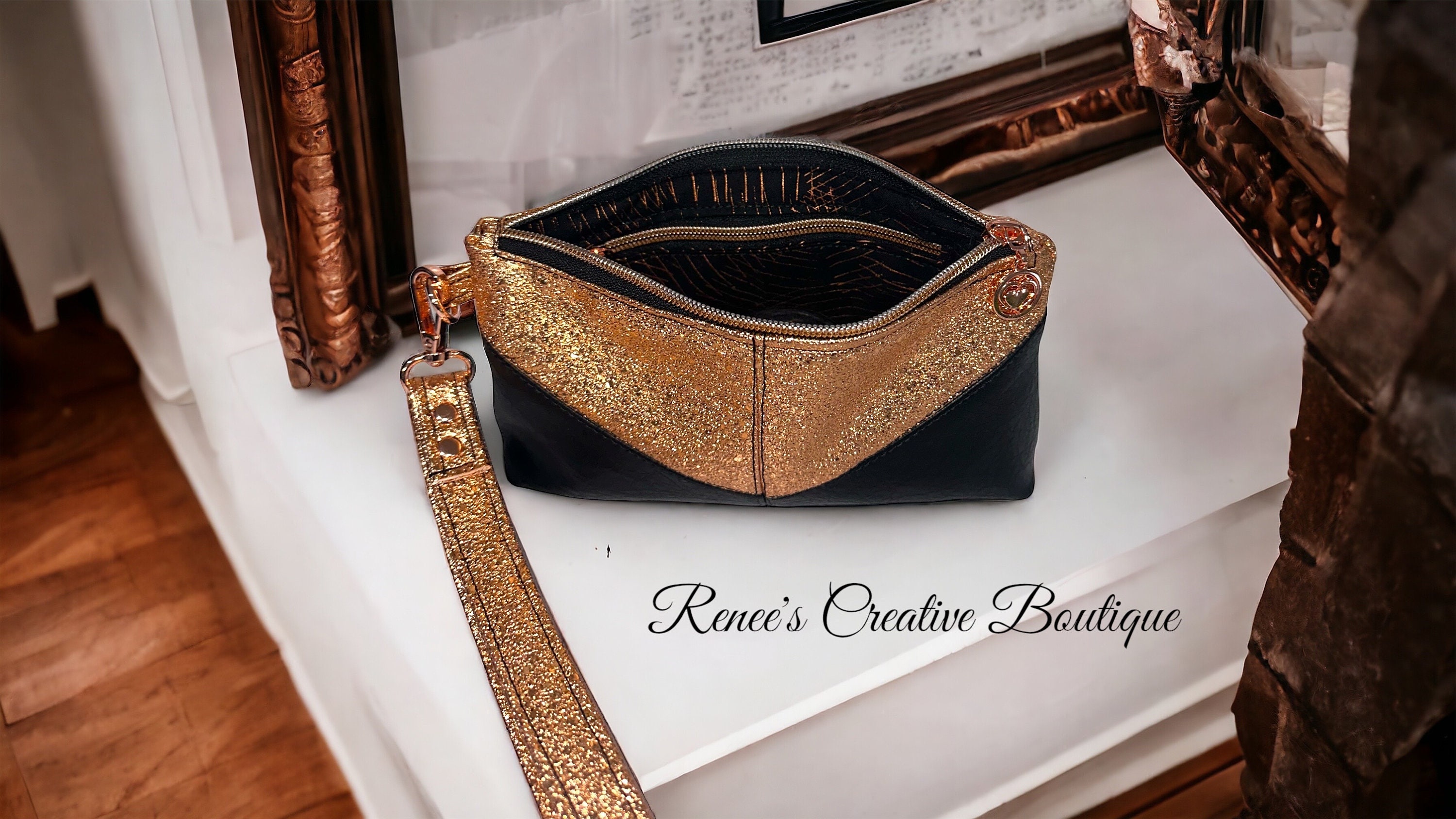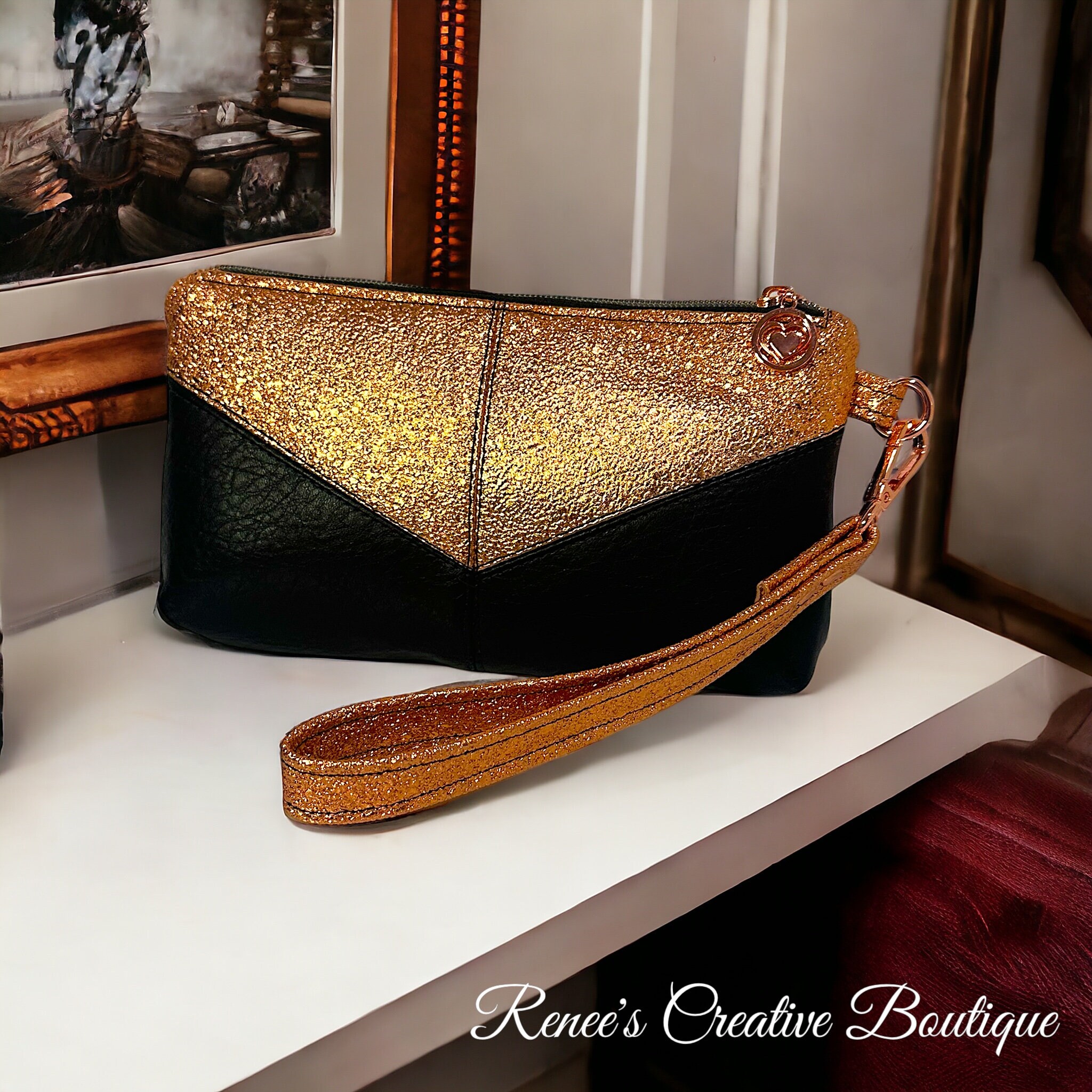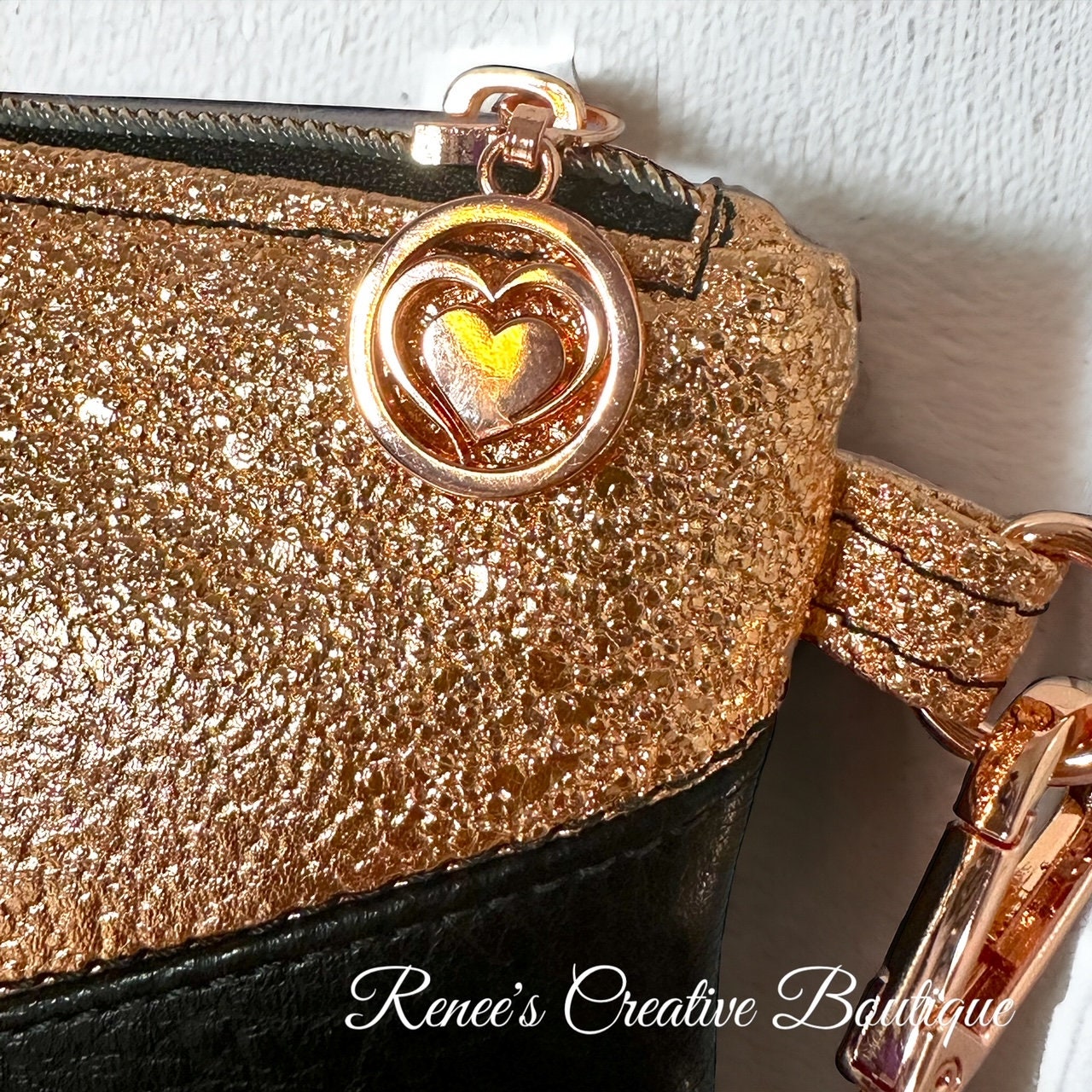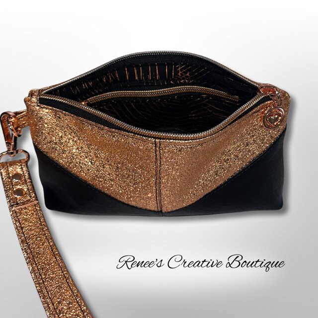Rose Gold and Black faux leather wristlet. Size is 9" x 5". Includes a pretty heart zipper pull. The lining is a black and metallic copper cotton. The color is more of a rose gold to copper color. It is not a regular gold color. Very beautiful purse perfect for an evening out.