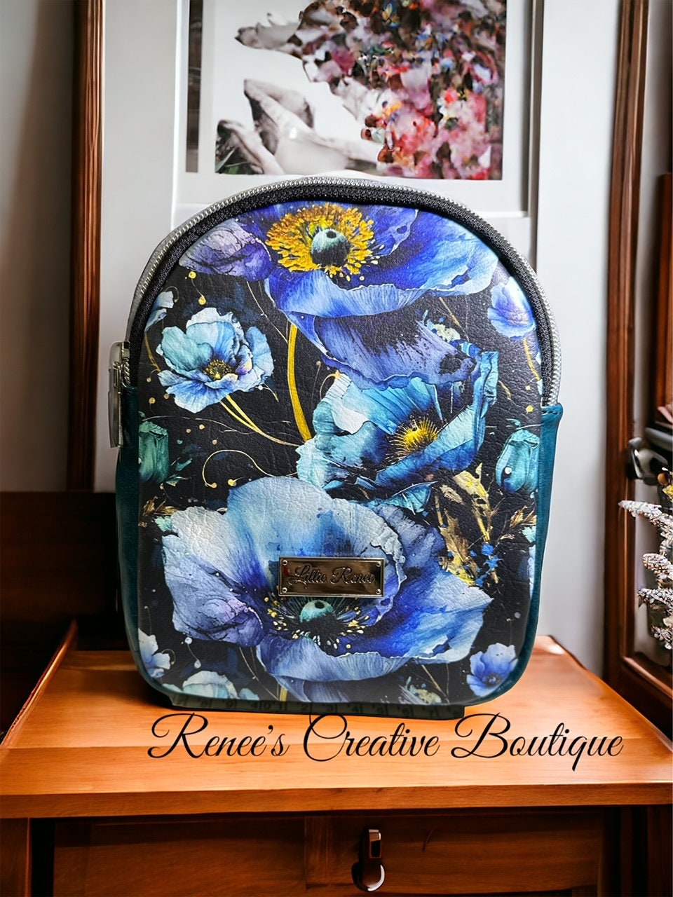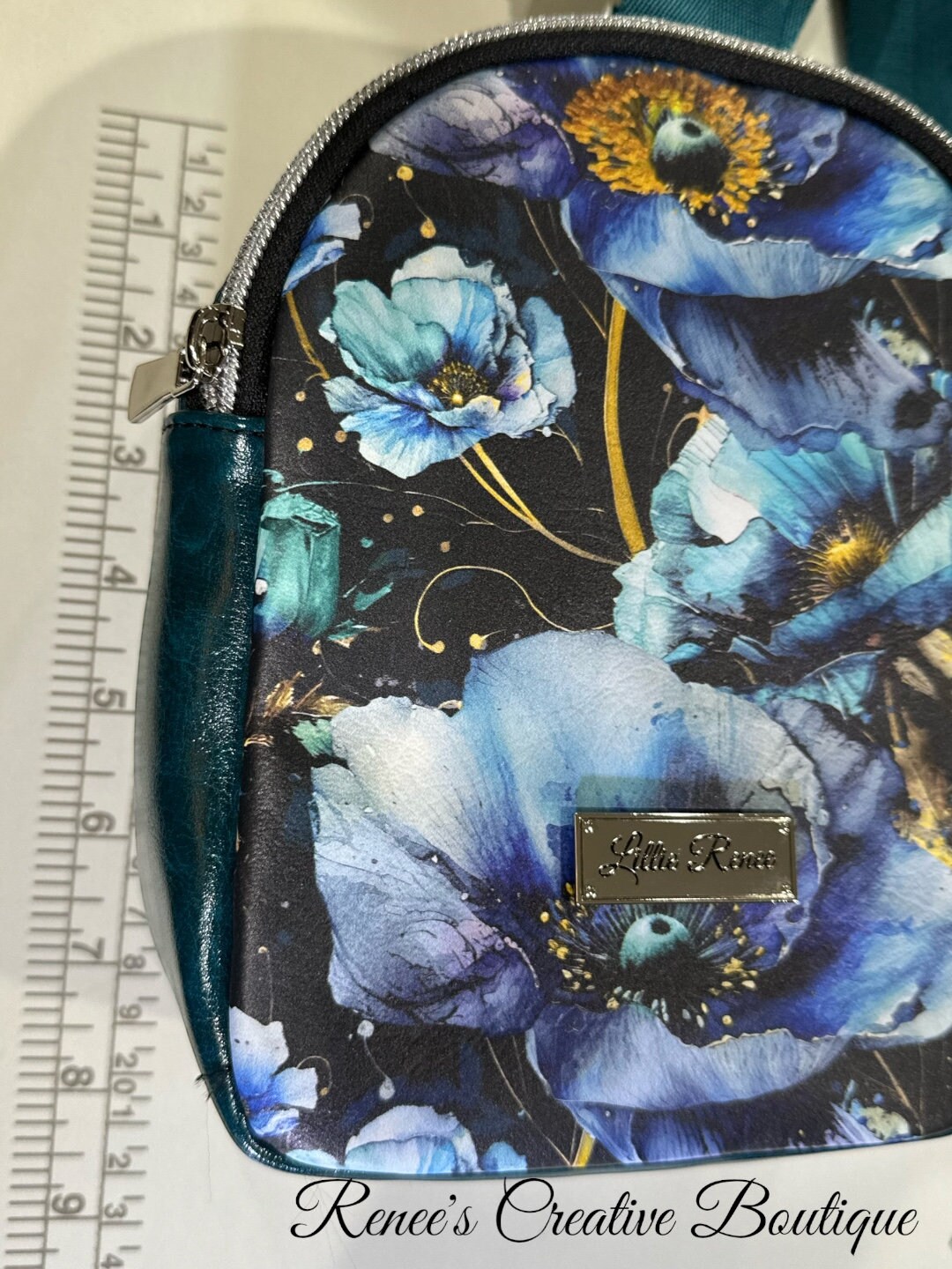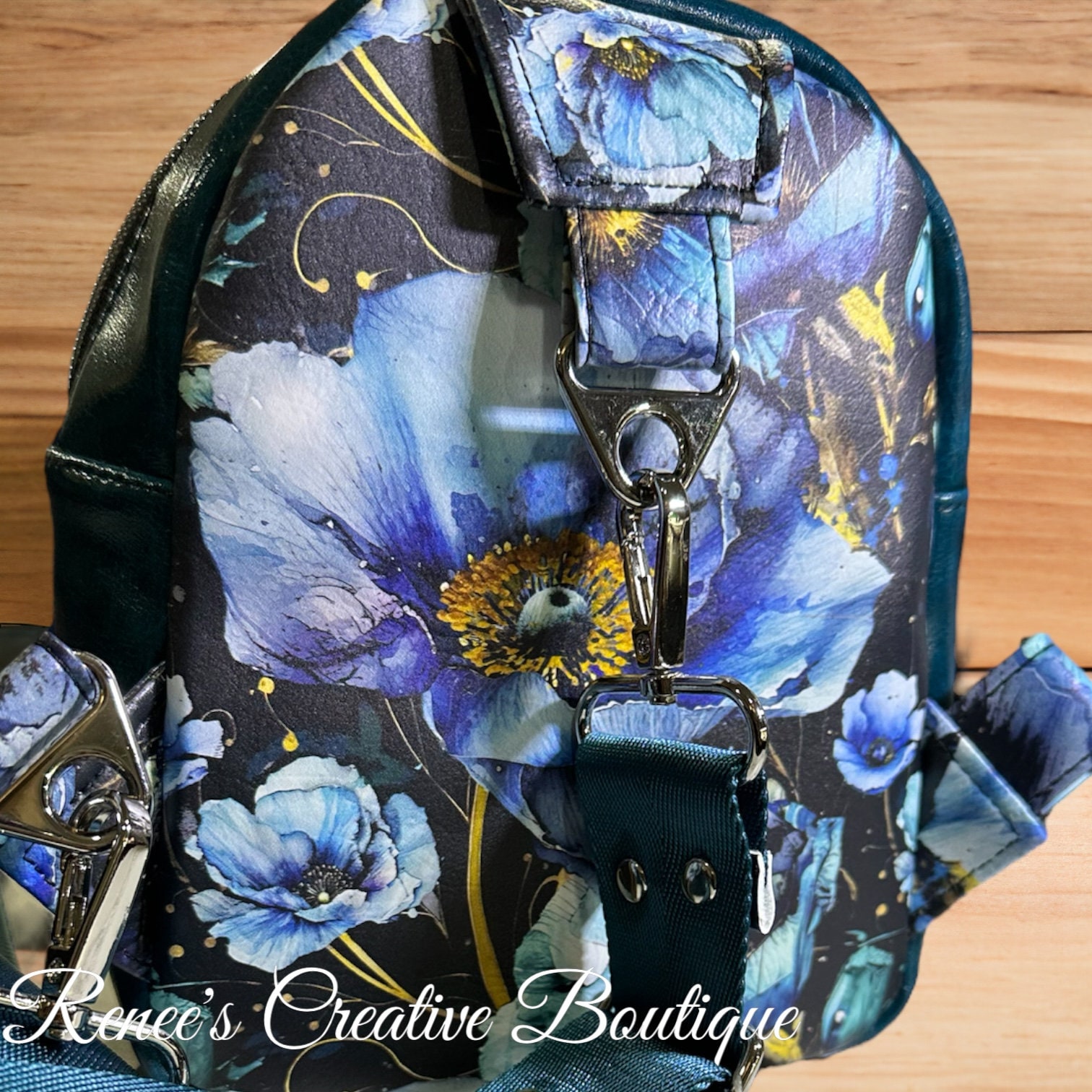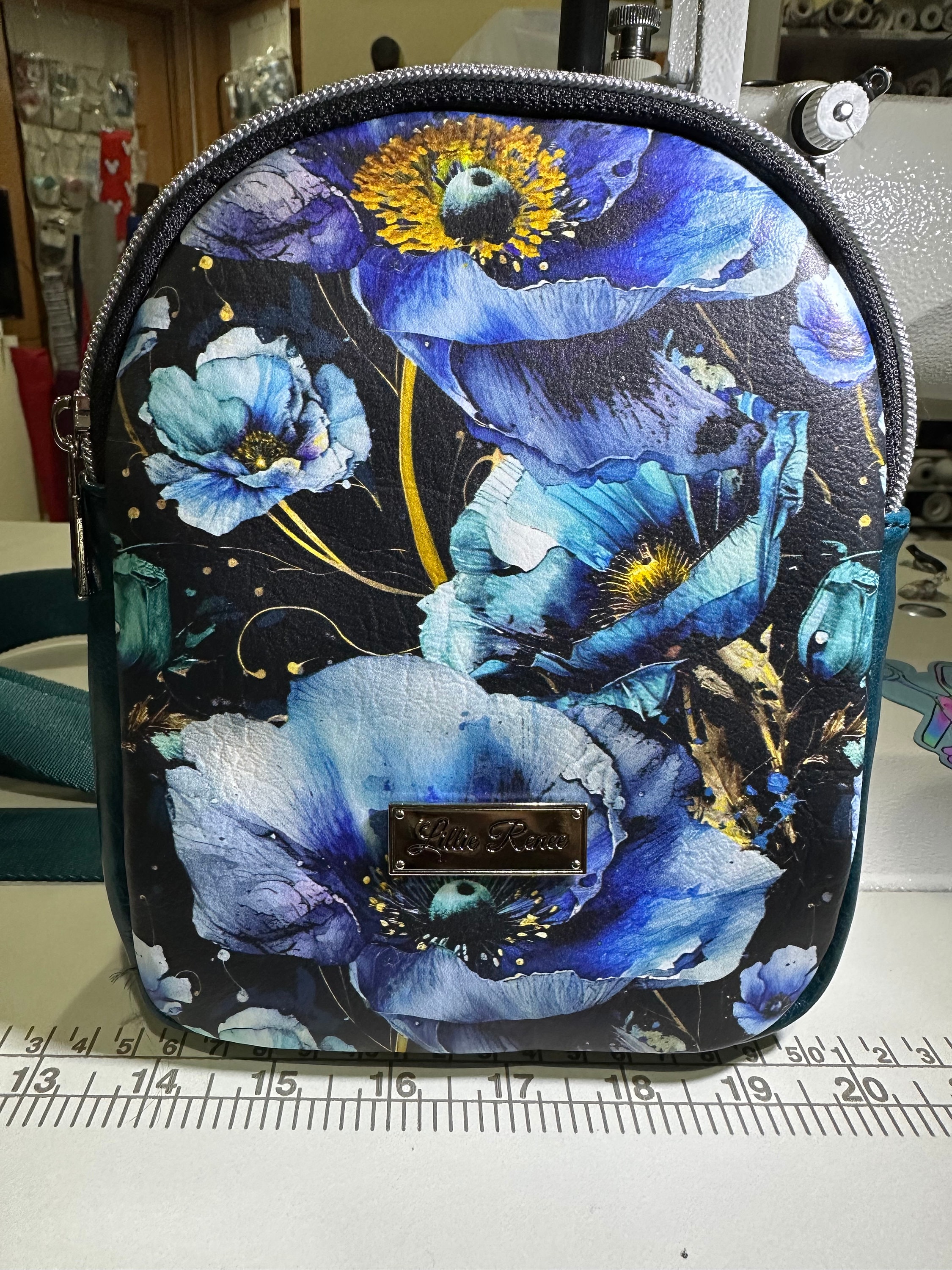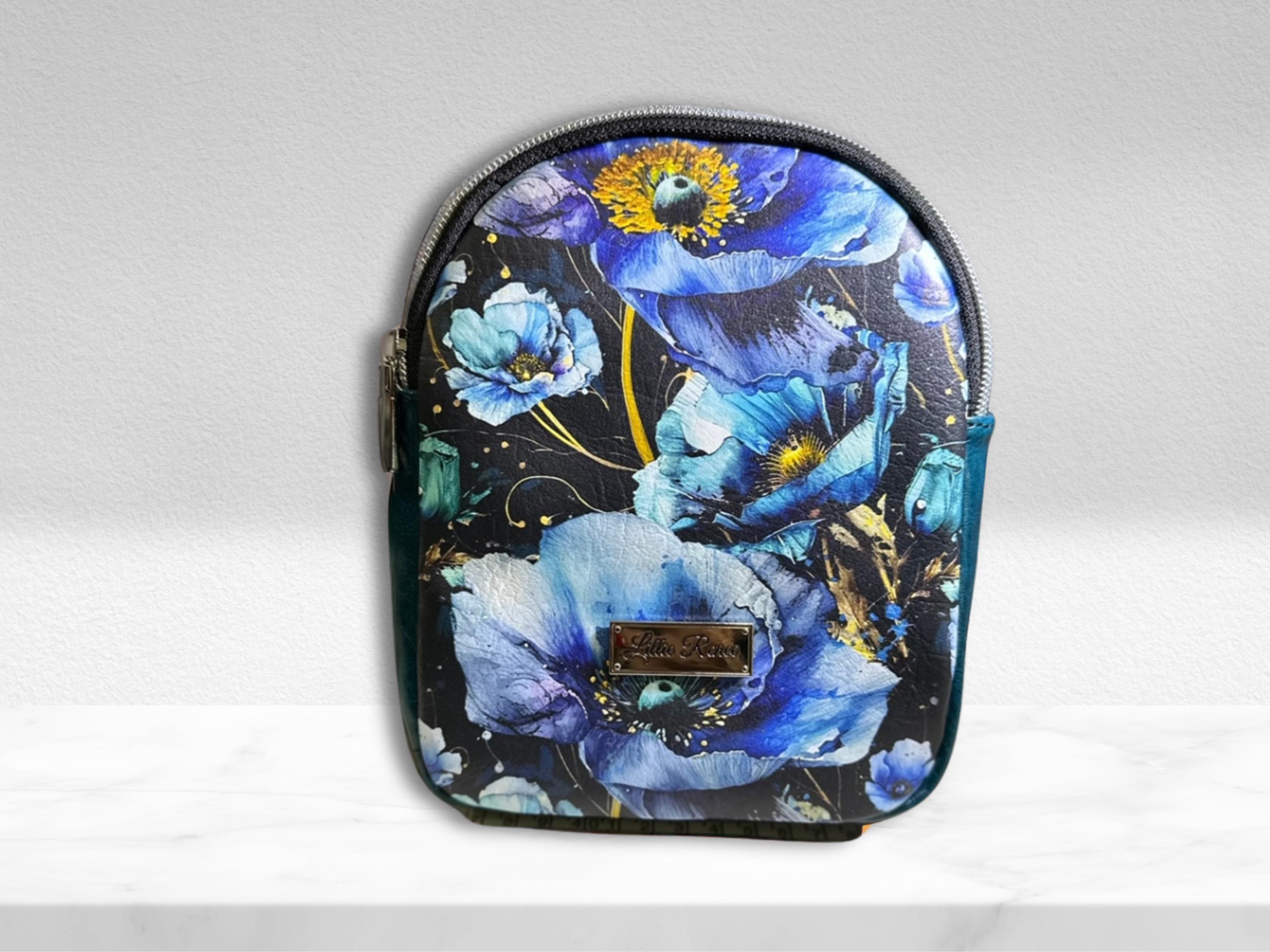 Cute small backpack sling is designed with blue poppies vinyl. The interior is water resistant canvas with one zipper pocket. The sling has one strap which can be move to hang on your right or left shoulder. The bag is 8" x 6" x 2 1/2" with a 46" adjustable strap.