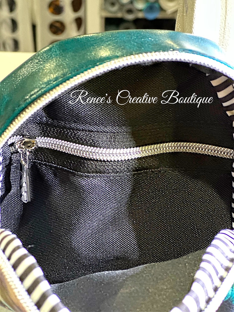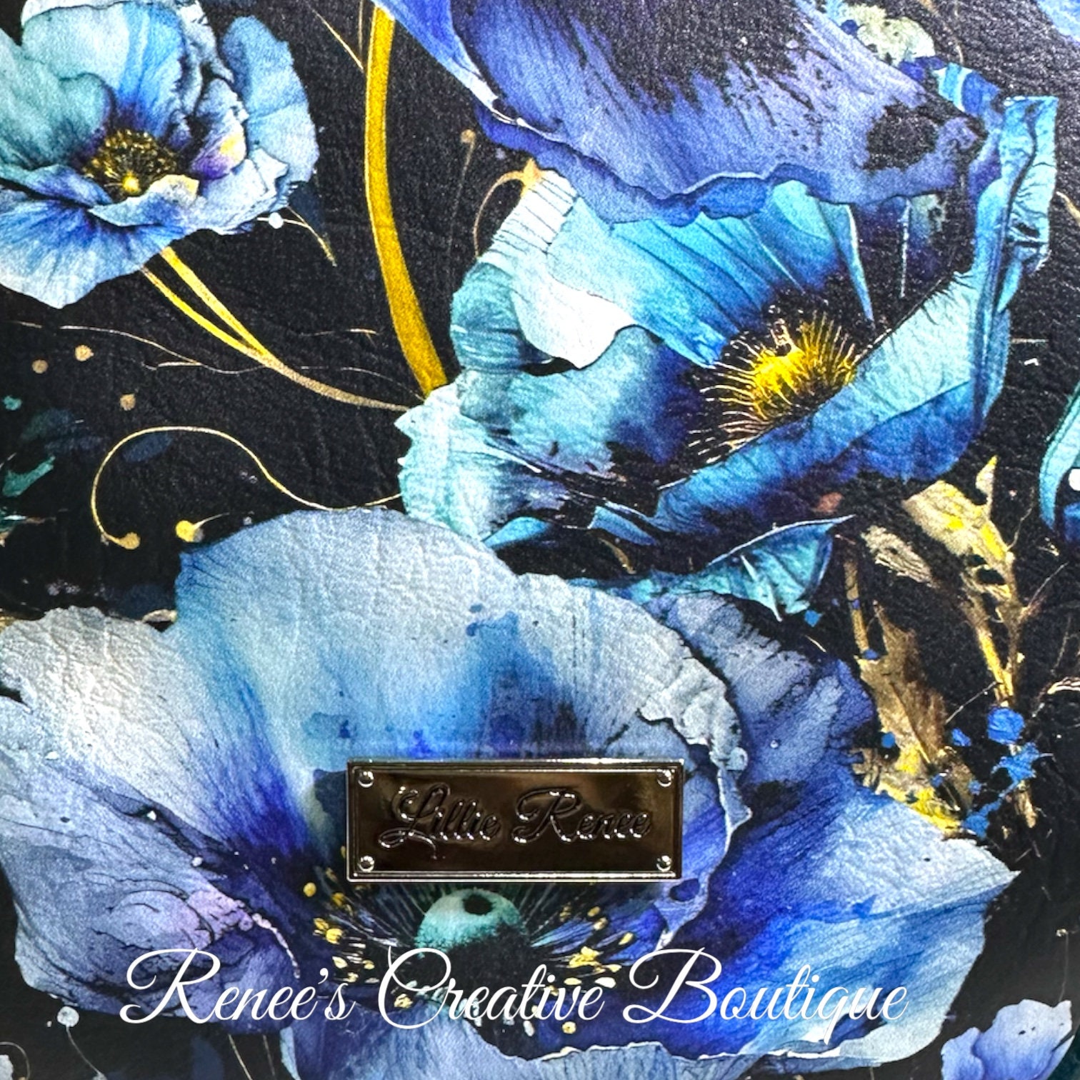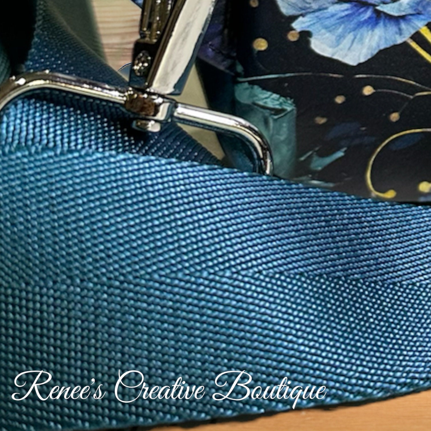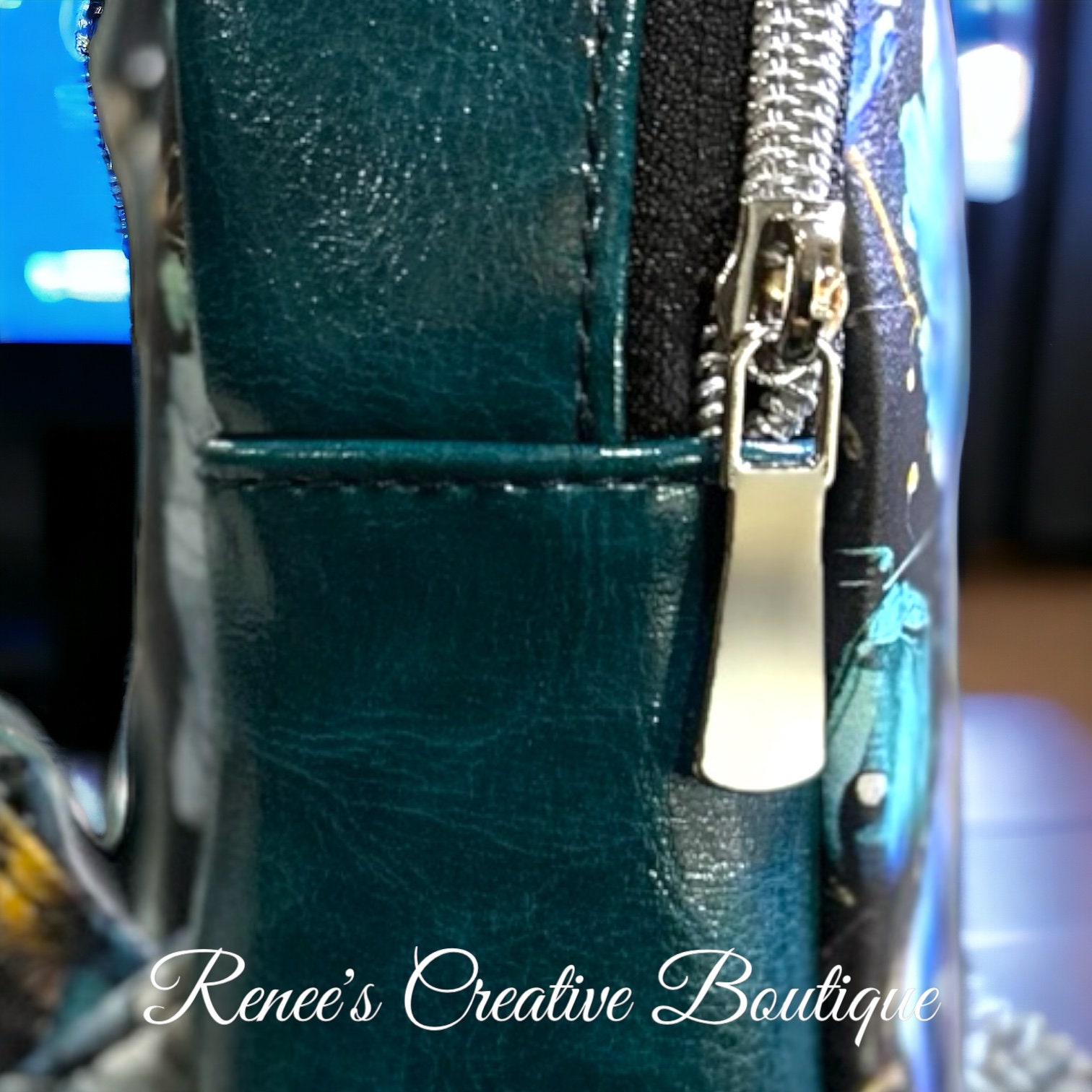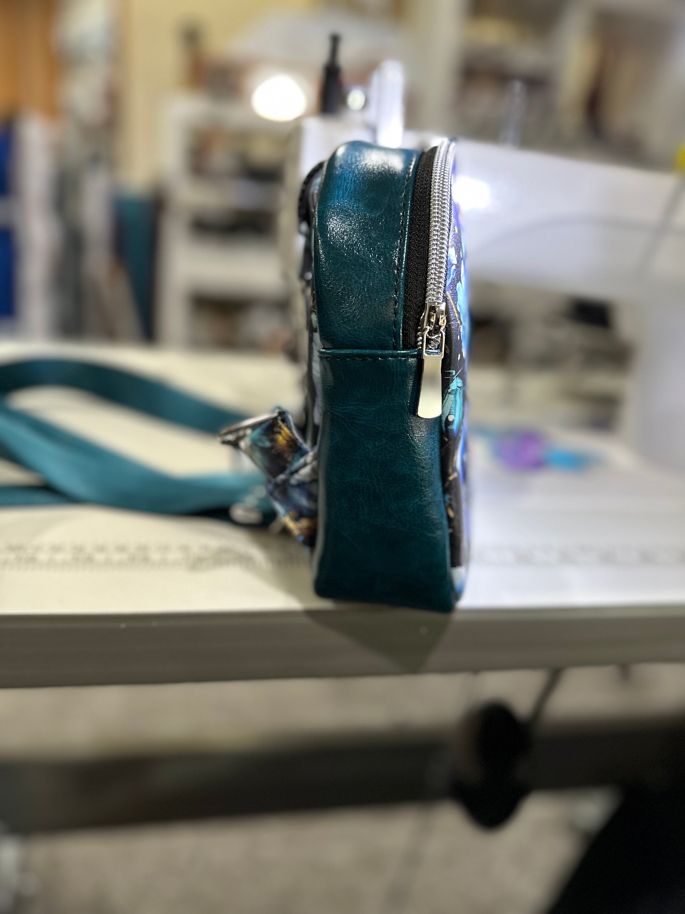 Cute small backpack sling is designed with blue poppies vinyl. The interior is water resistant canvas with one zipper pocket. The sling has one strap which can be move to hang on your right or left shoulder. The bag is 8" x 6" x 2 1/2" with a 46" adjustable strap.