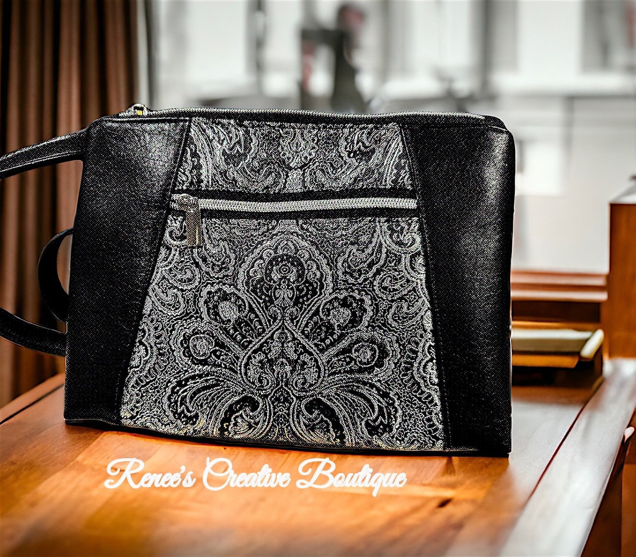This popular Sunshine Crossbody is designed with black and metallic silver fabric and black faux leather. It includes an exterior zipper pocket and an interior zipper pocket and silver hardware. It comes with an adjustable faux leather strap. The bag is 10.5" x 7.5" x 3".
