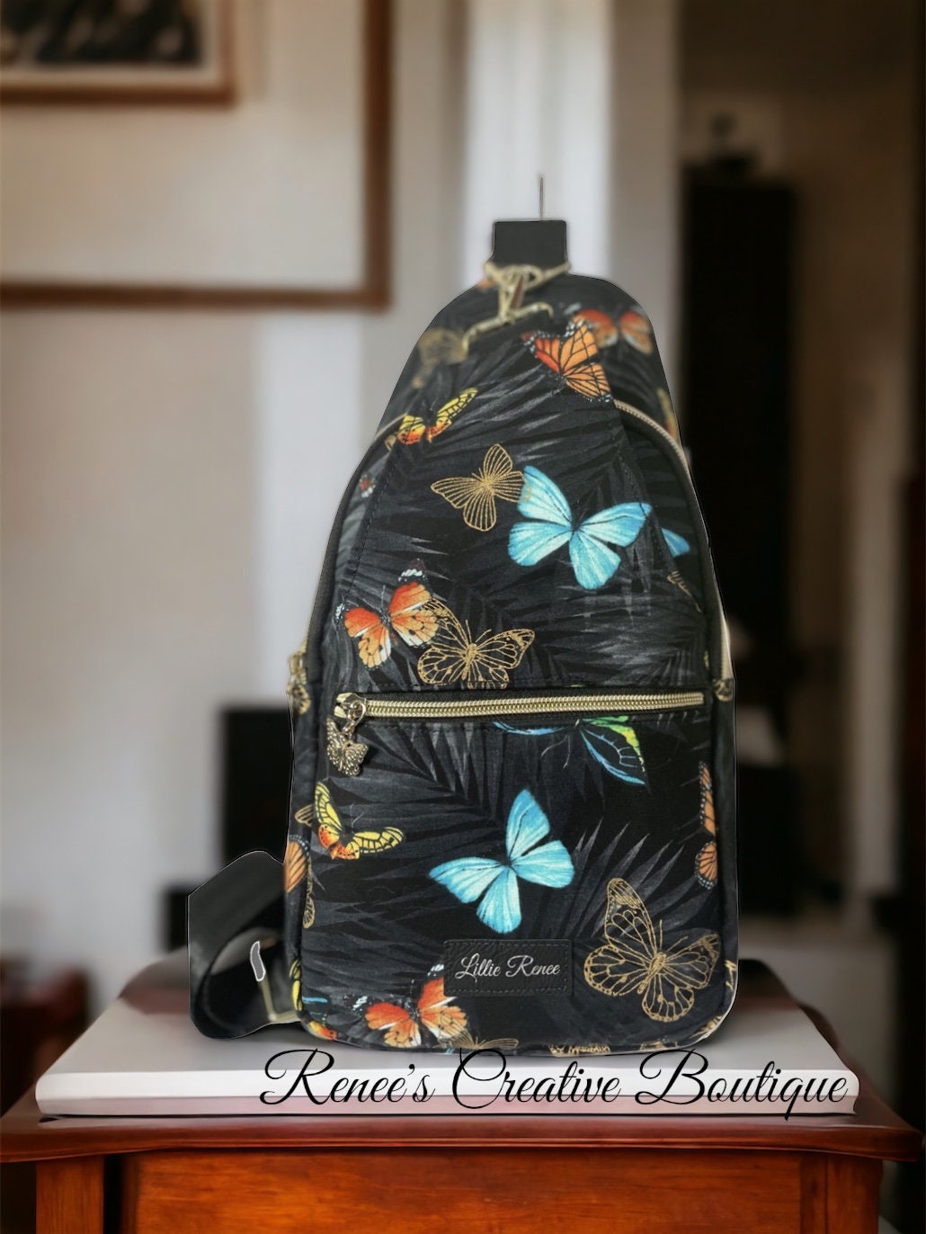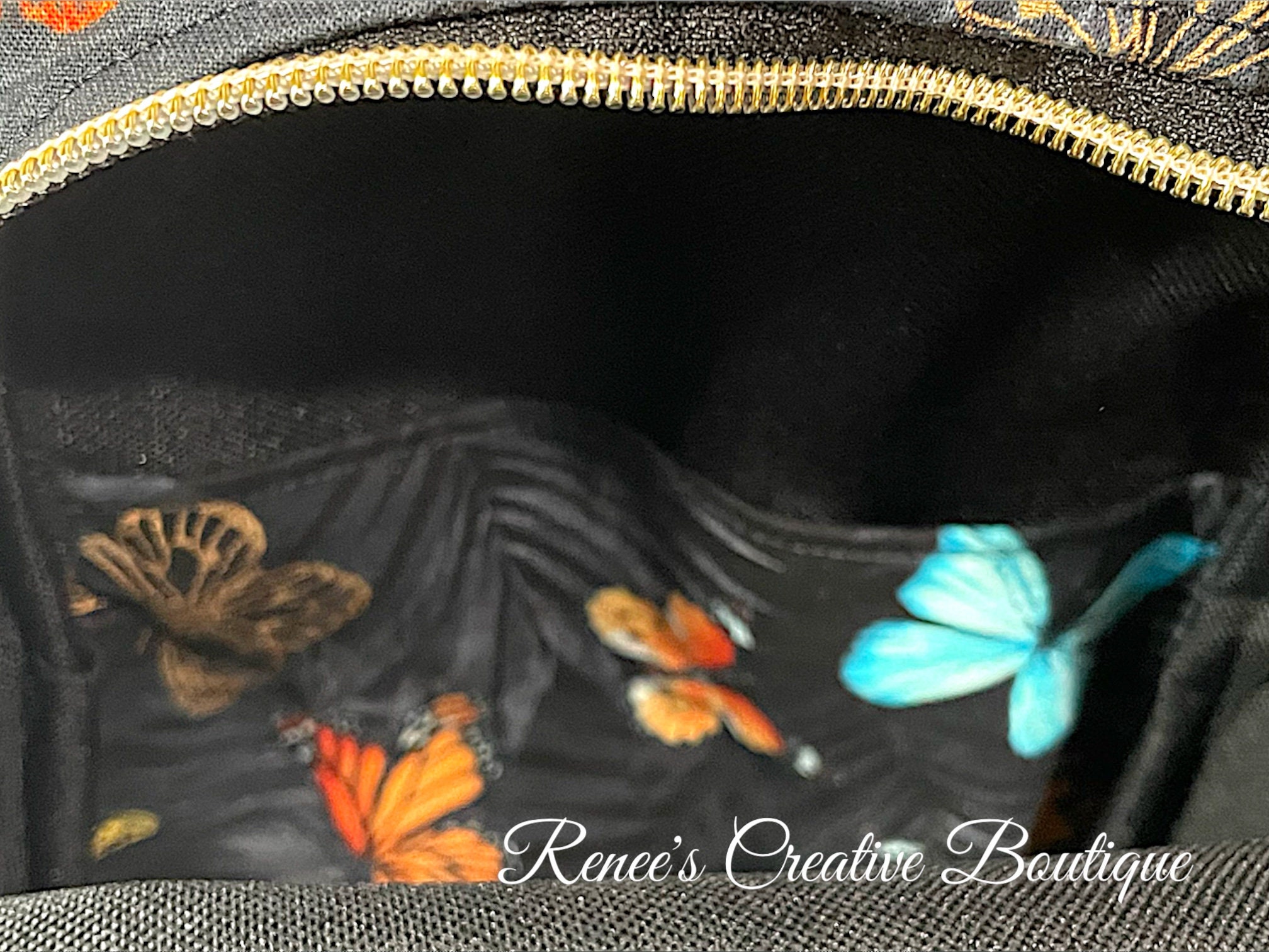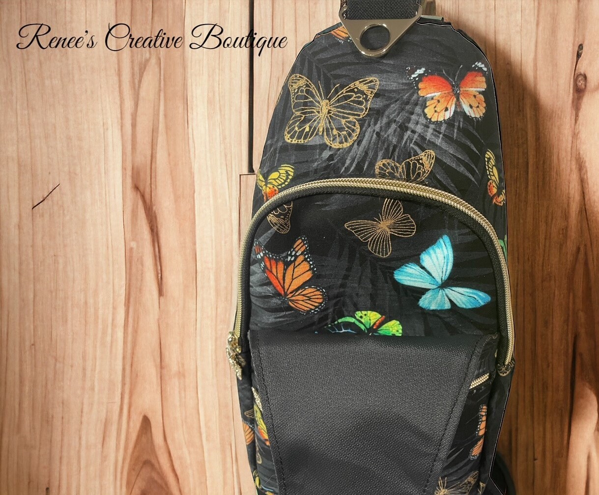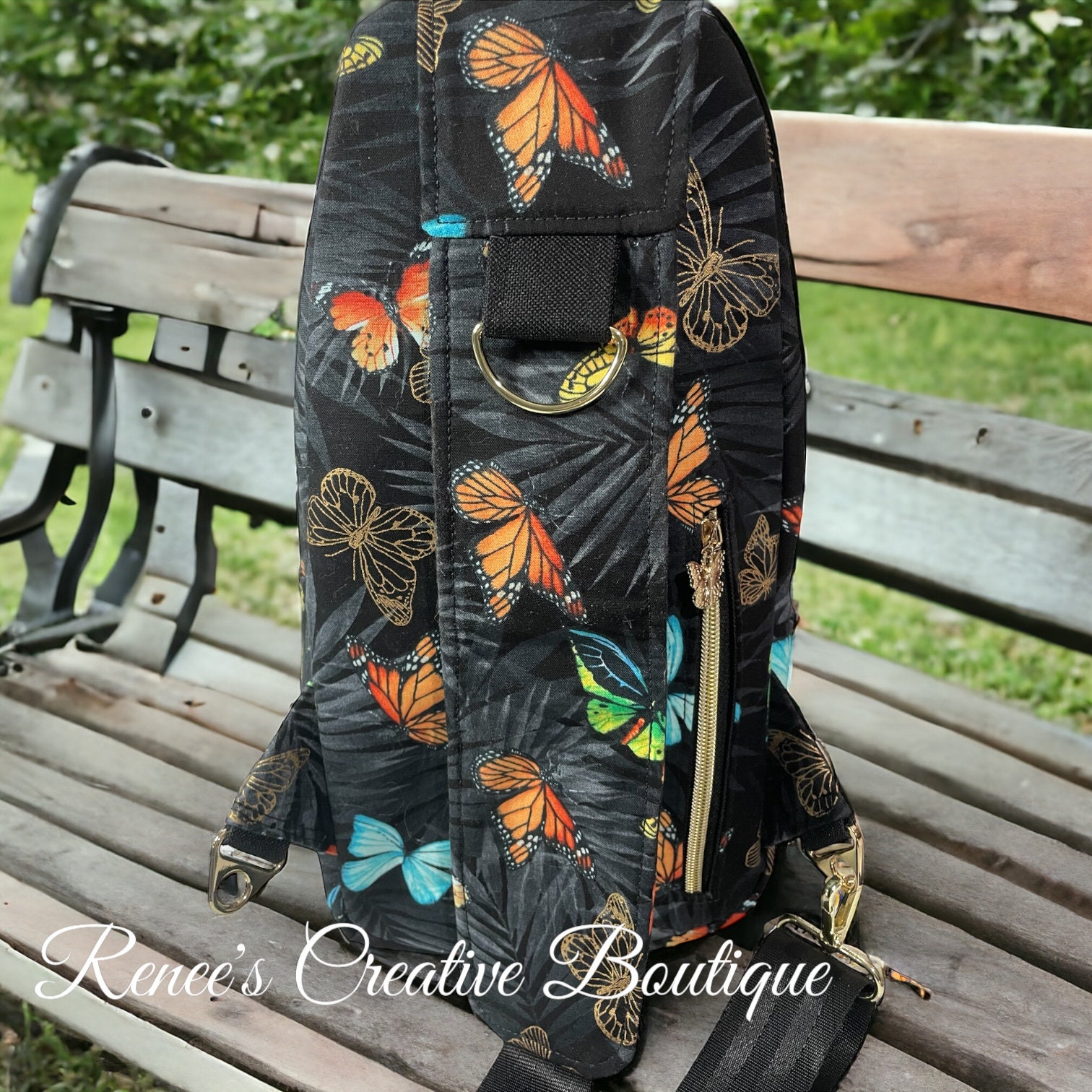 The trendy Retro Sling is designed with cotton butterflies fabric featuring black. orange, blue and metallic gold butterflies on a light fern print black background. The sling has lots of pockets including front and back zipper pockets with gold butterfly zipper pulls. There is a front slip pocket and an interior double slip pocket. There are two d-rings on the top, one to carry the bag and one to hang the bag. On the lower back of the sling there is a triangle ring on each side so you have your choice of which shoulder you wish to wear the sling. The bag measures 7" wide, 14" tall and 3" deep.