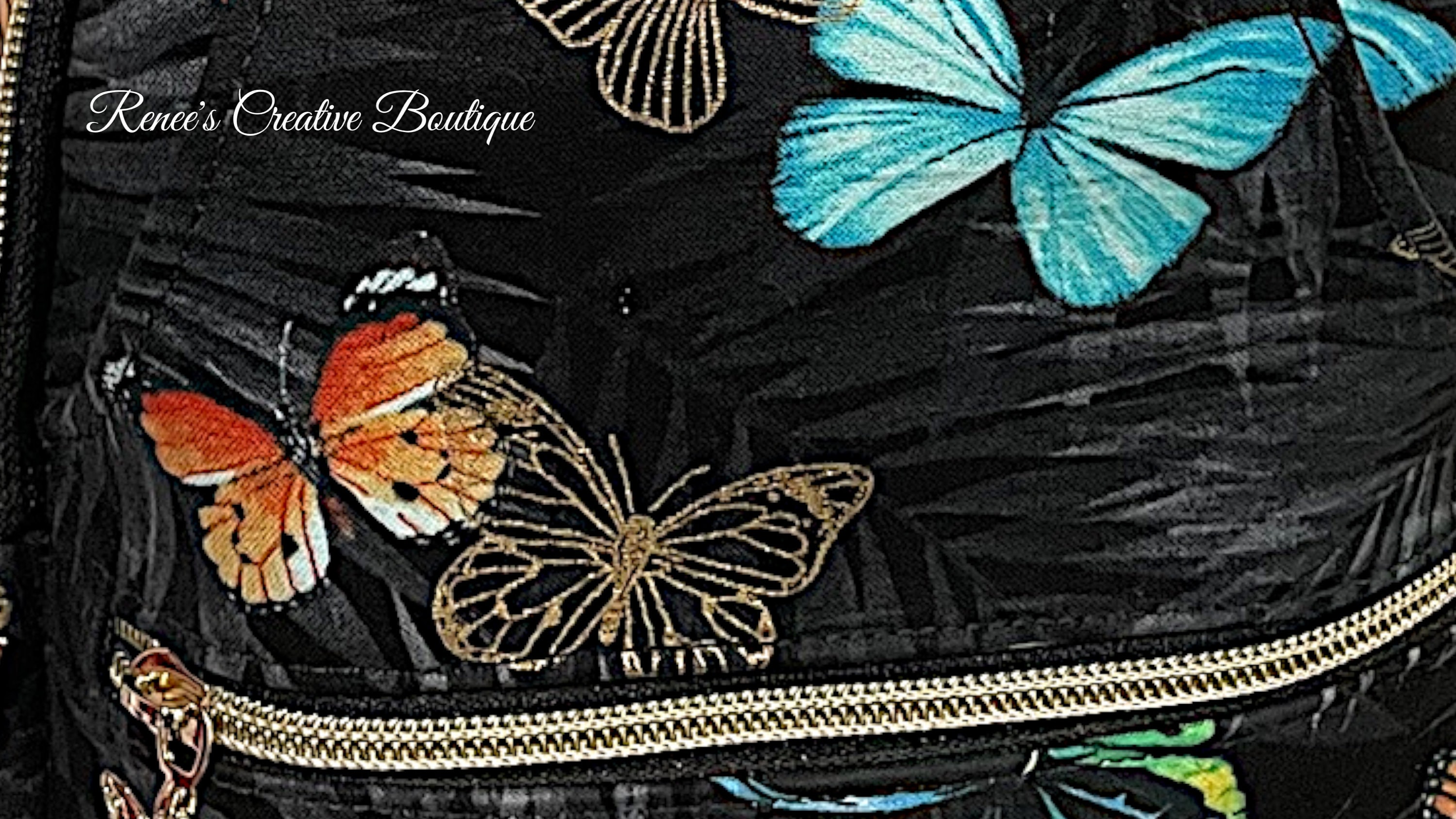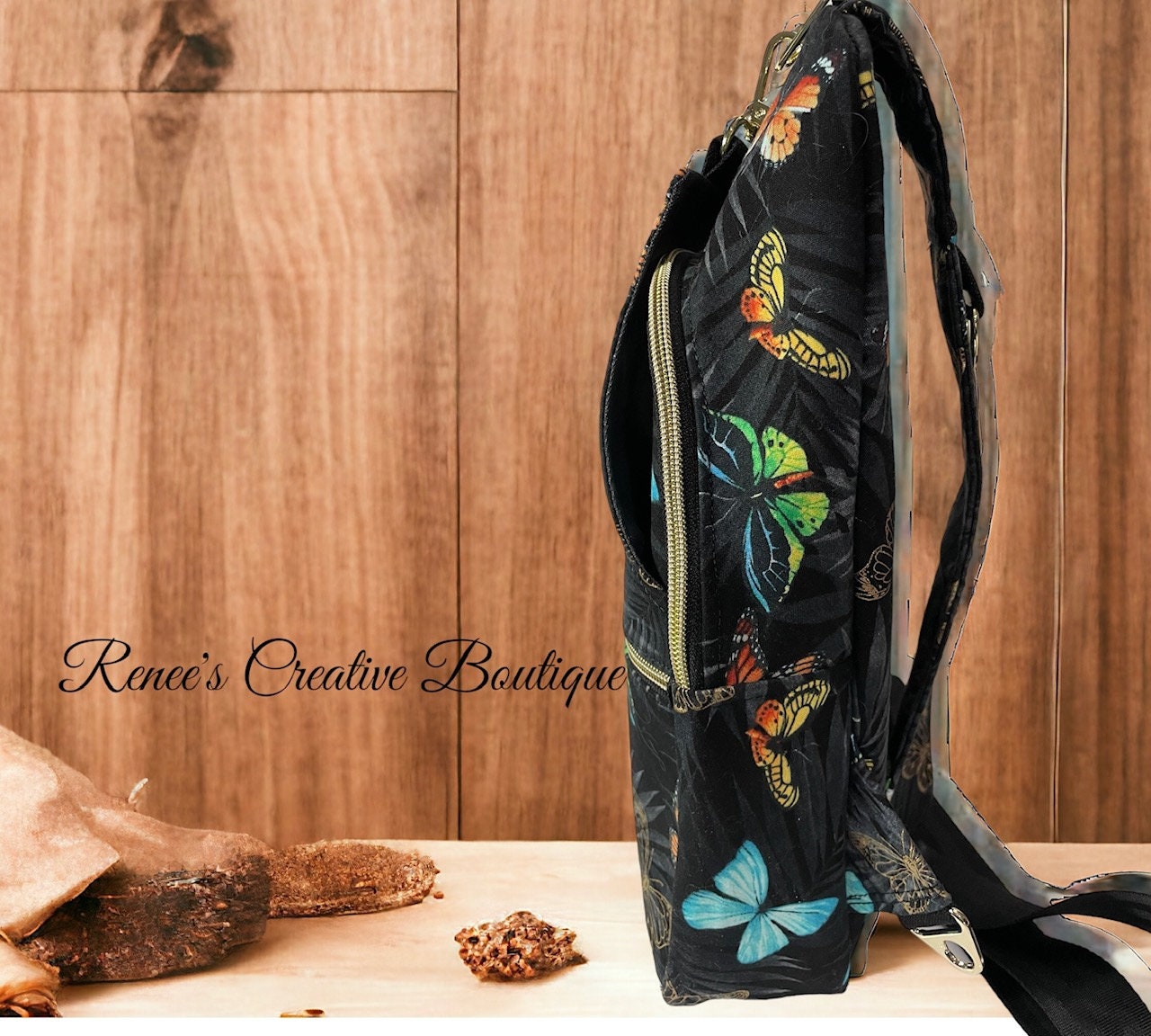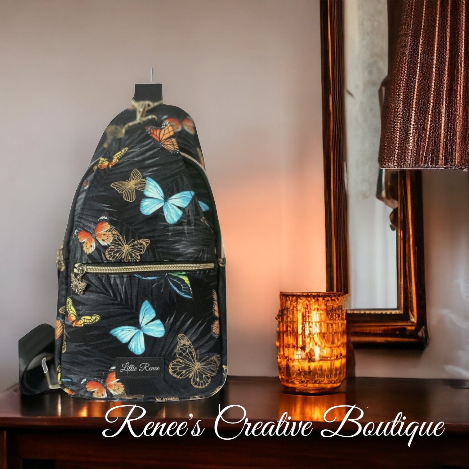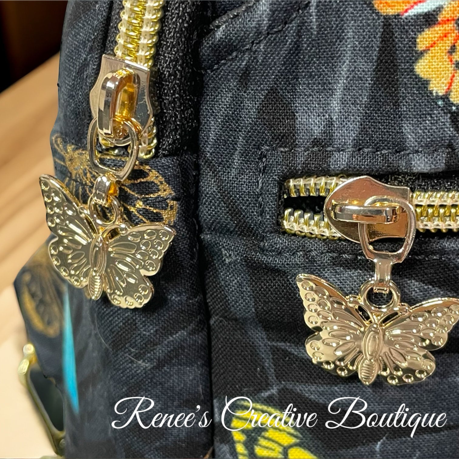 The trendy Retro Sling is designed with cotton butterflies fabric featuring black. orange, blue and metallic gold butterflies on a light fern print black background. The sling has lots of pockets including front and back zipper pockets with gold butterfly zipper pulls. There is a front slip pocket and an interior double slip pocket. There are two d-rings on the top, one to carry the bag and one to hang the bag. On the lower back of the sling there is a triangle ring on each side so you have your choice of which shoulder you wish to wear the sling. The bag measures 7" wide, 14" tall and 3" deep.