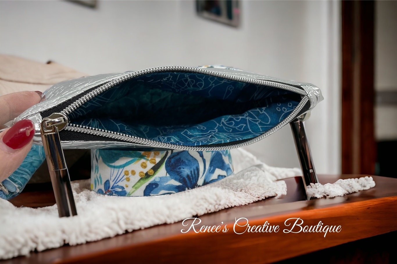 The Blue Blossom Mini Purse is the perfect blend of feminine charm and bold sophistication. Crafted from delicate blue floral cotton fabric and luxurious silver crocodile vinyl, this small yet stylish handbag (8” x 5”) is designed for those who love fashionable functionality in a compact size.