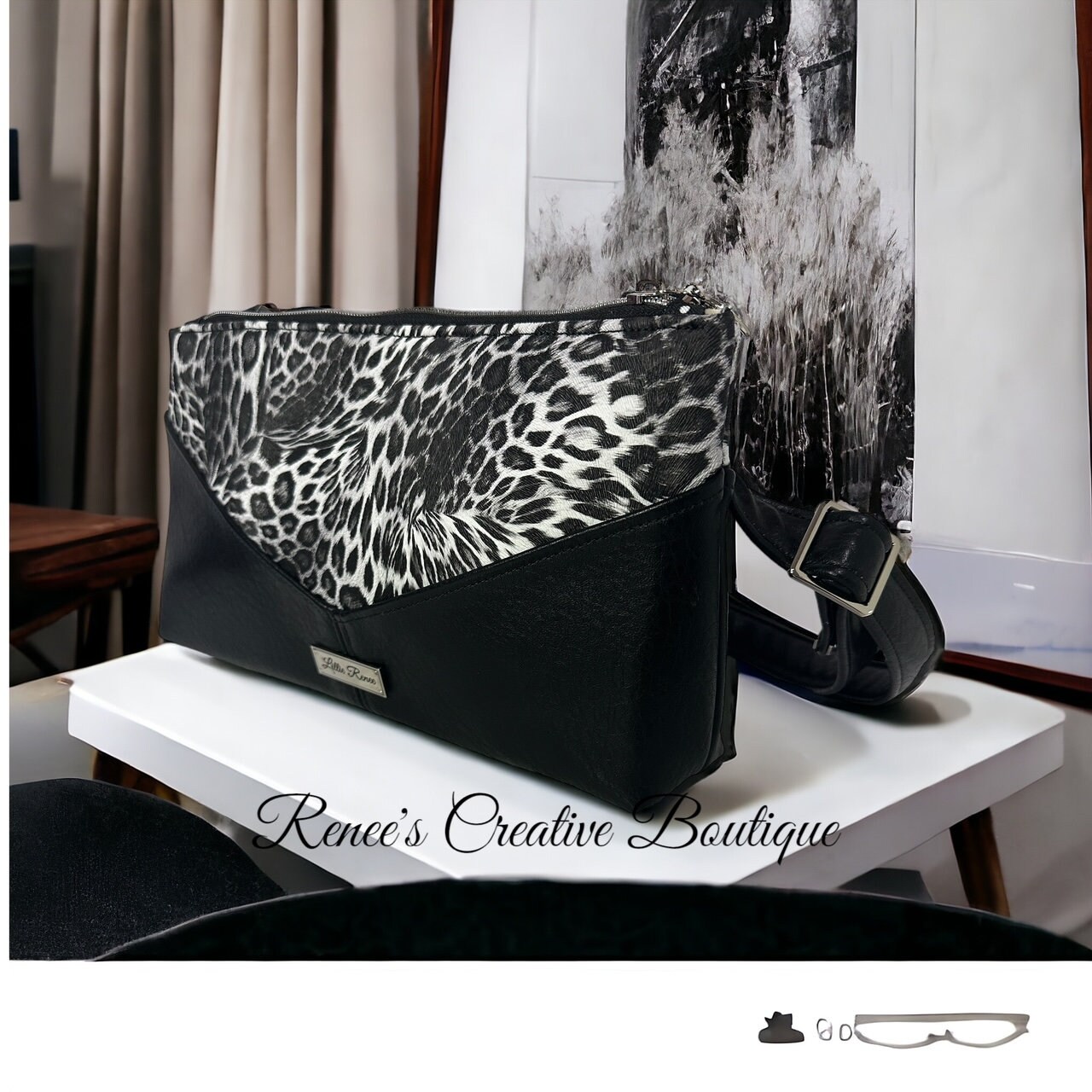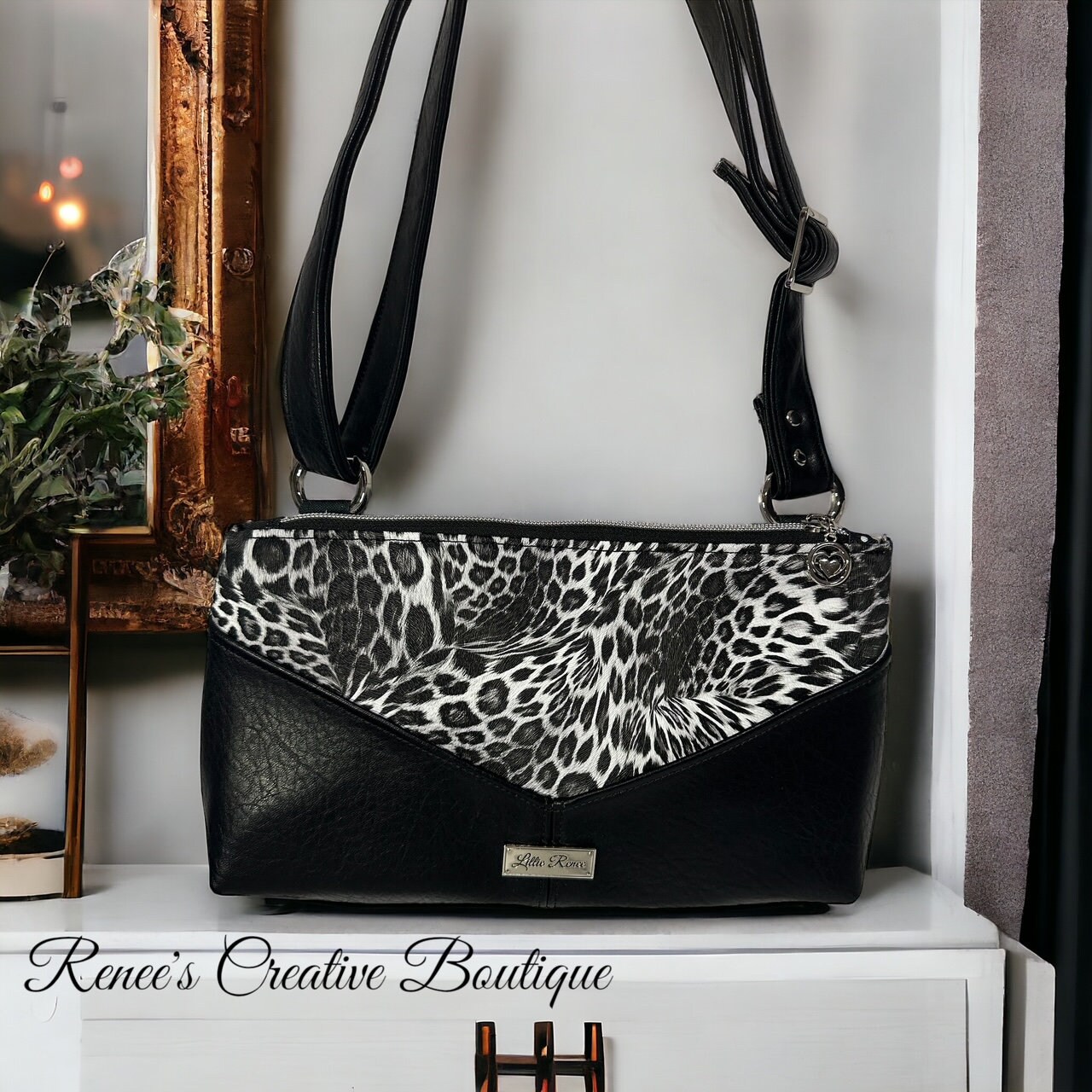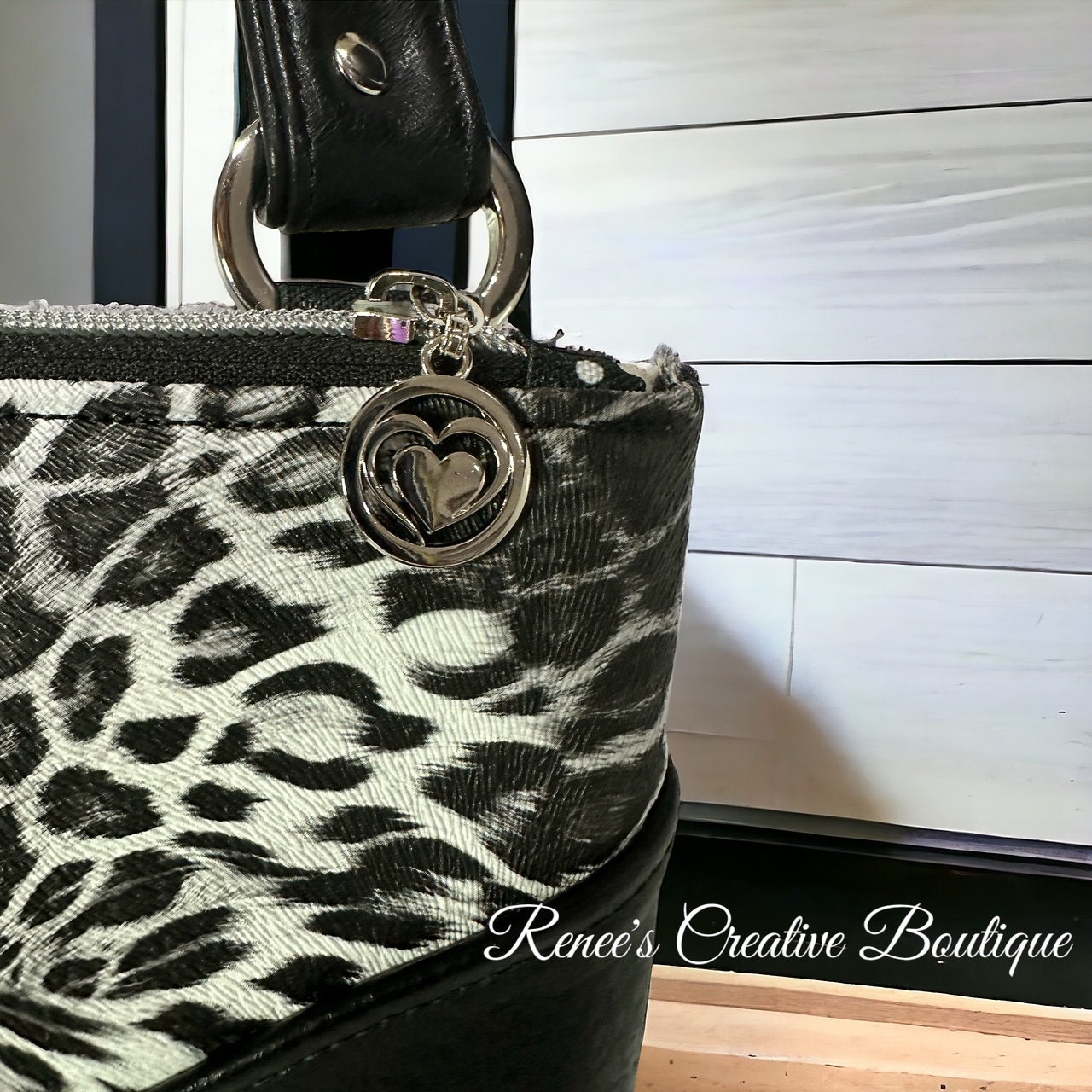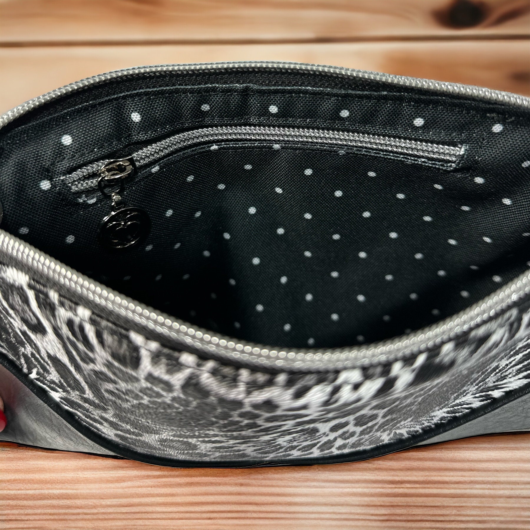 This Harlequin animal print crossbody is designed with Black Leopard vinyl and black faux leather The interior is black with white dots waterproof canvas. The purse features an interior zipper pocket and a top zipper closure each with a classy heart zipper pull.. The purse is 12" x 8".