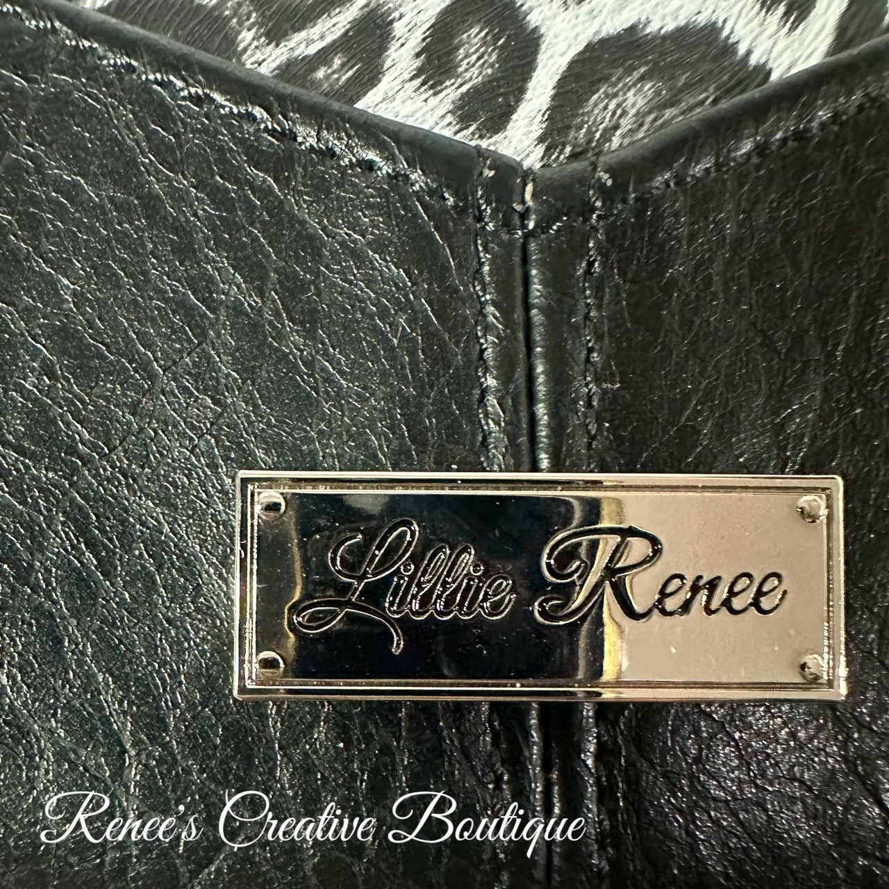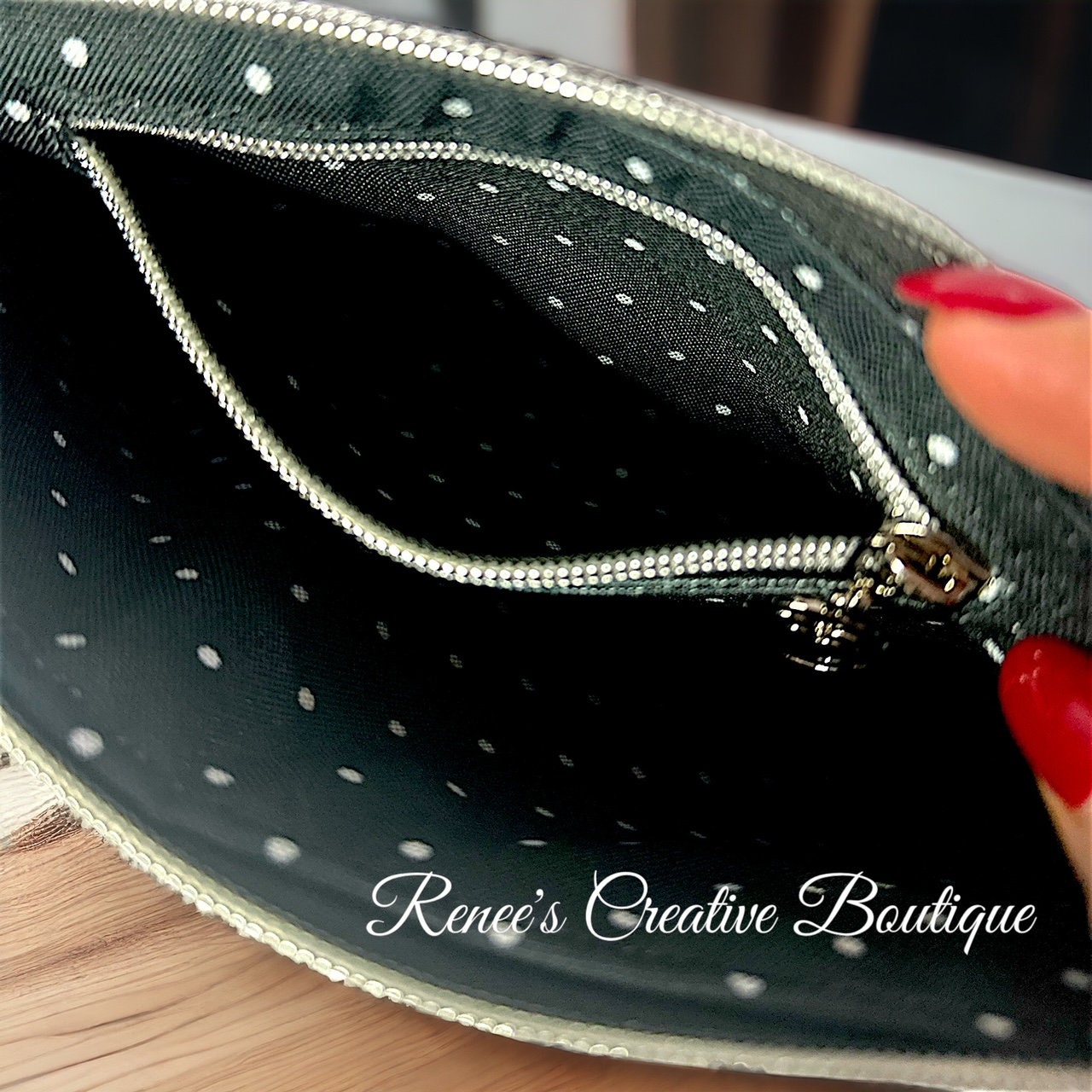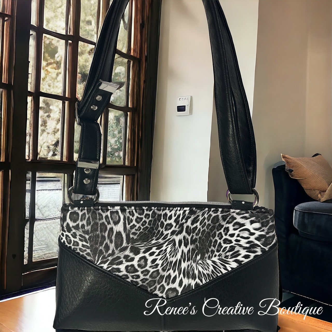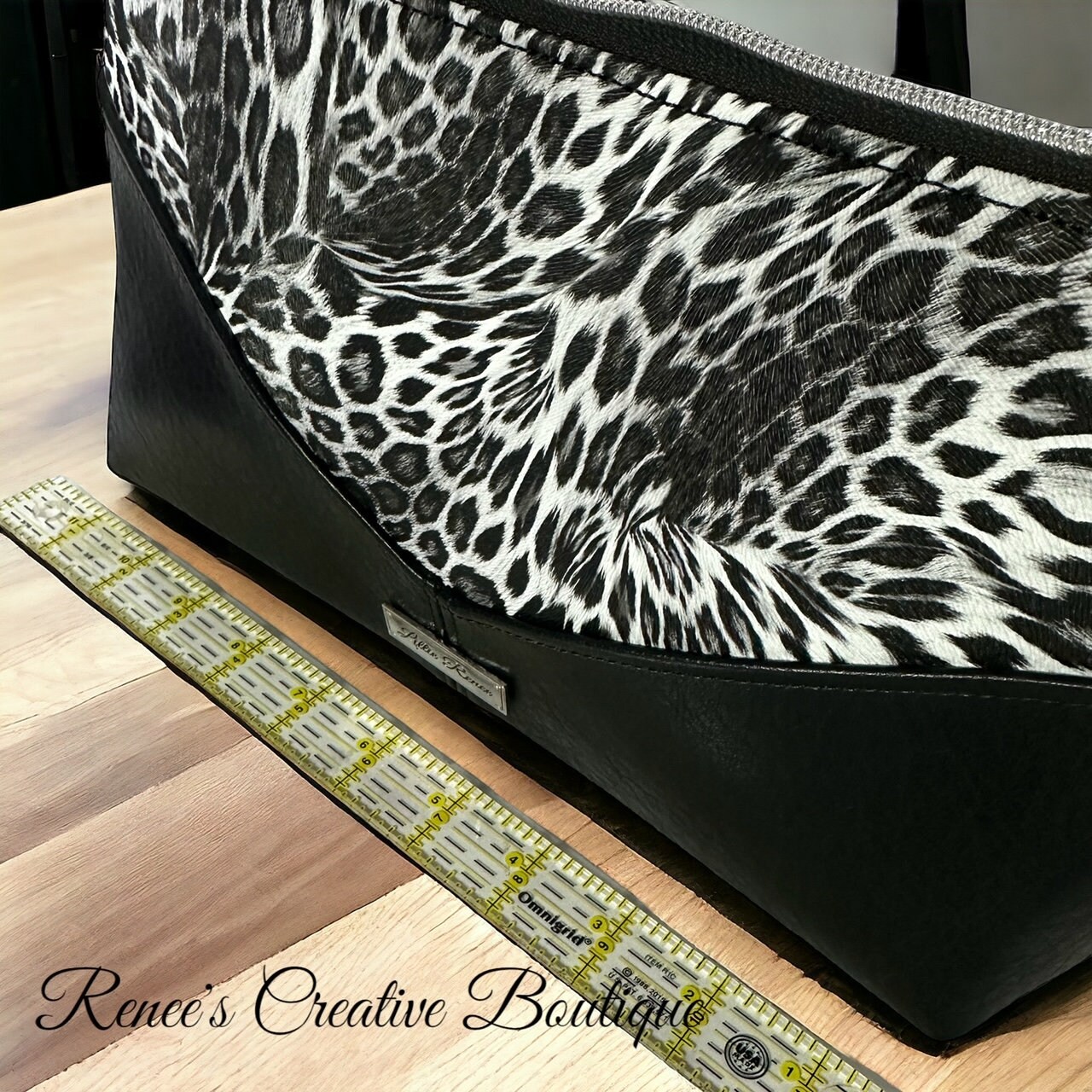 This Harlequin animal print crossbody is designed with Black Leopard vinyl and black faux leather The interior is black with white dots waterproof canvas. The purse features an interior zipper pocket and a top zipper closure each with a classy heart zipper pull.. The purse is 12" x 8".