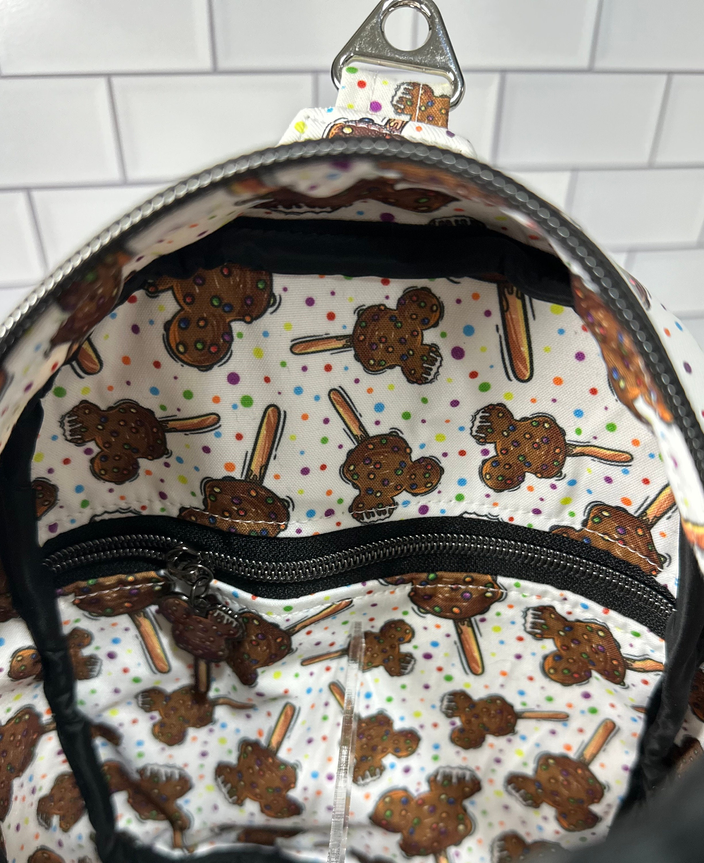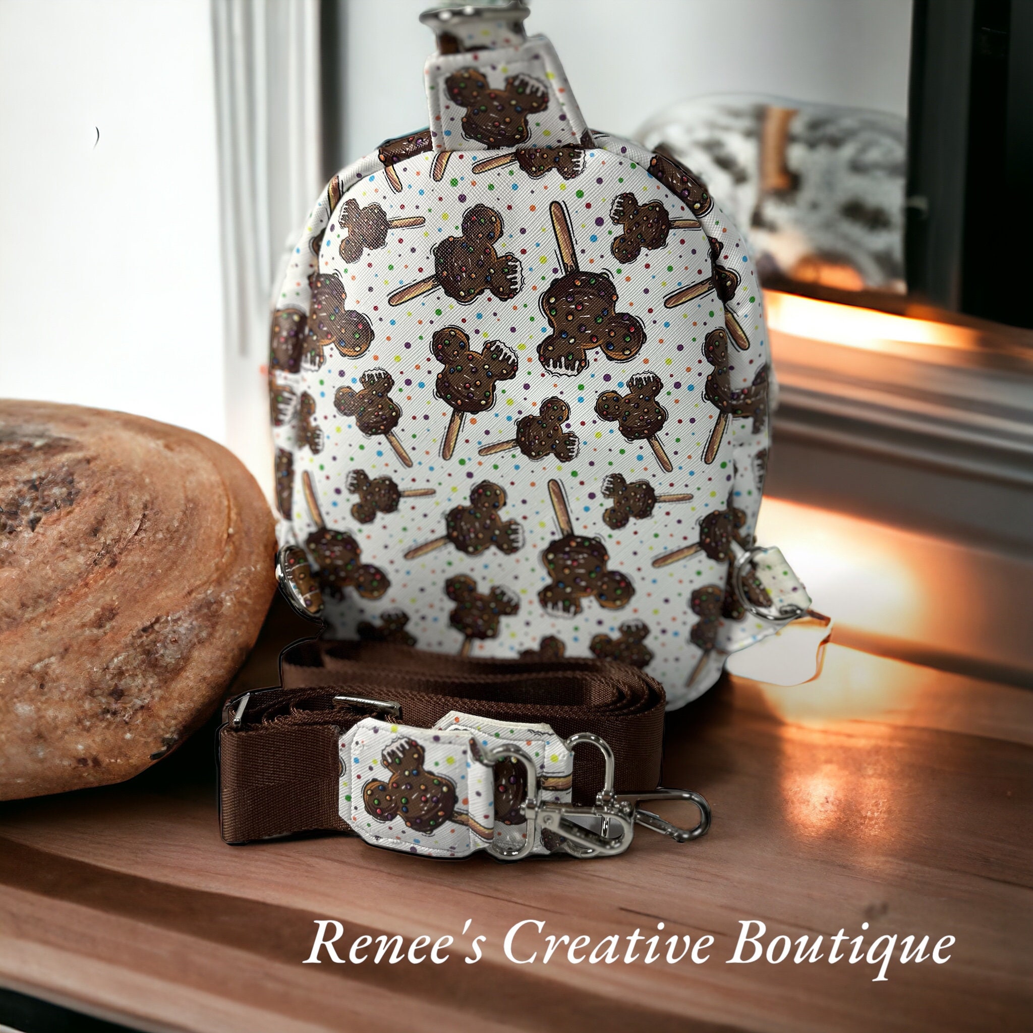 This larger version of the Mav Pack is designed with MM ice cream bars vinyl on the exterior and MM ice cream bars coordinating waterproof canvas on the interior. This Mav Pak includes an interior pocket and zipper top closure. The straps are brown seatbelt webbing finished off with MM vinyl on the ends. It features gunmetal hardware and MM ice cream bar zipper pulls. The bag measures 7.5" x 9" x 3.