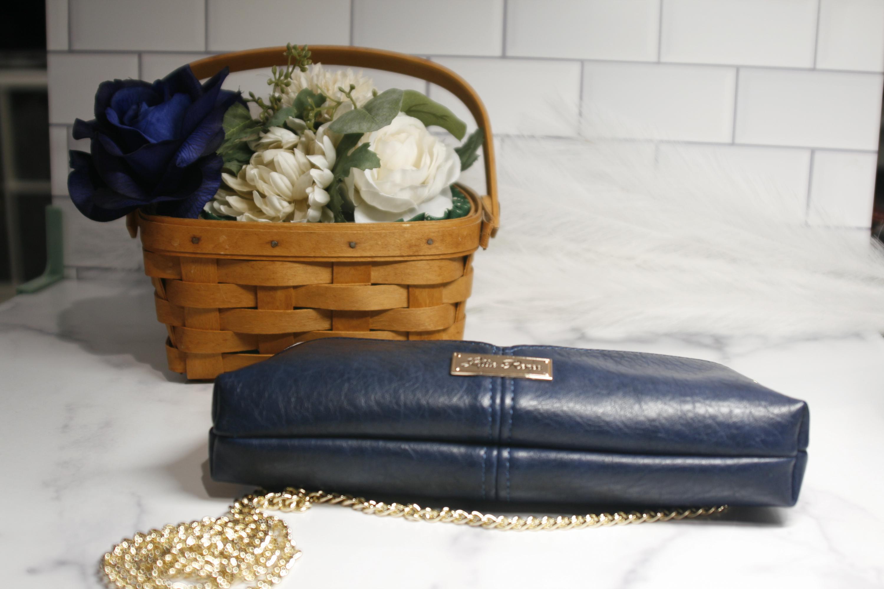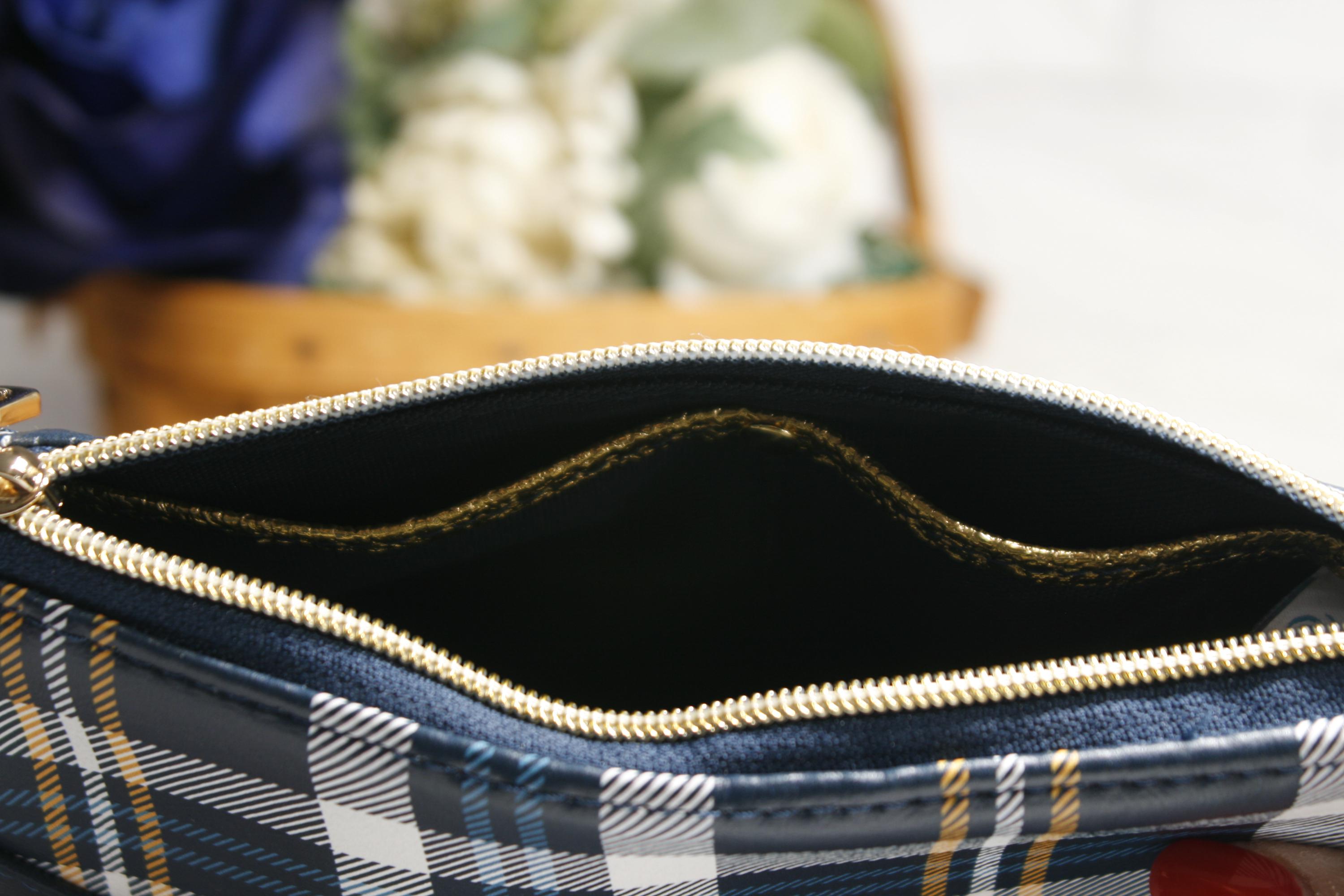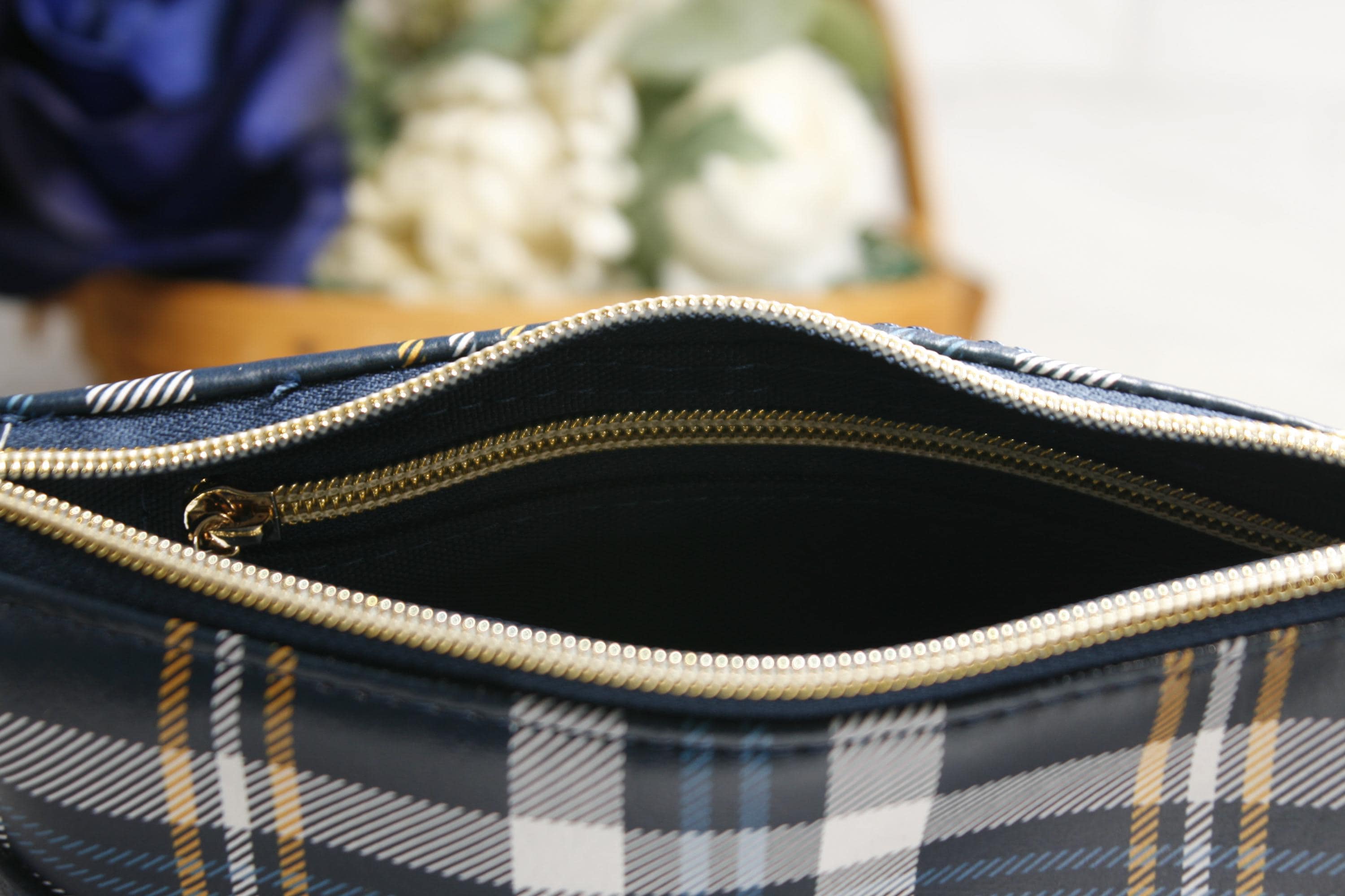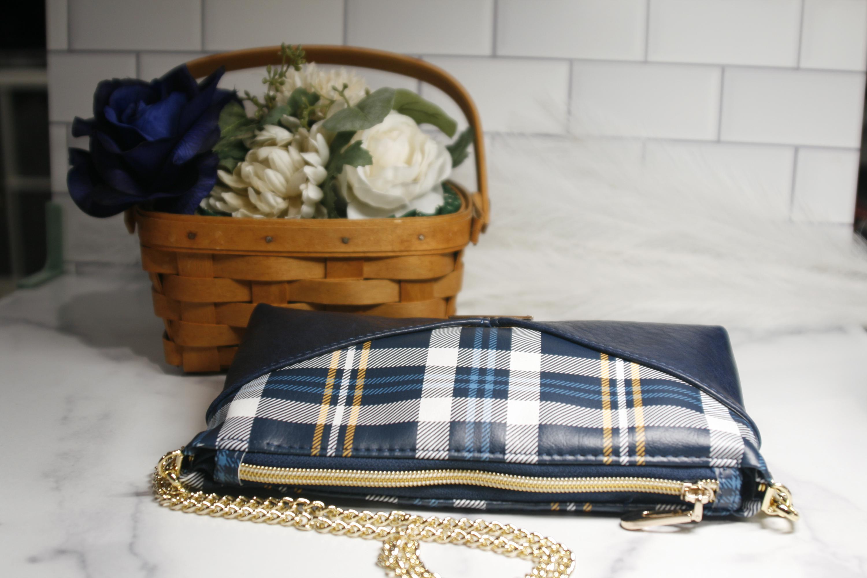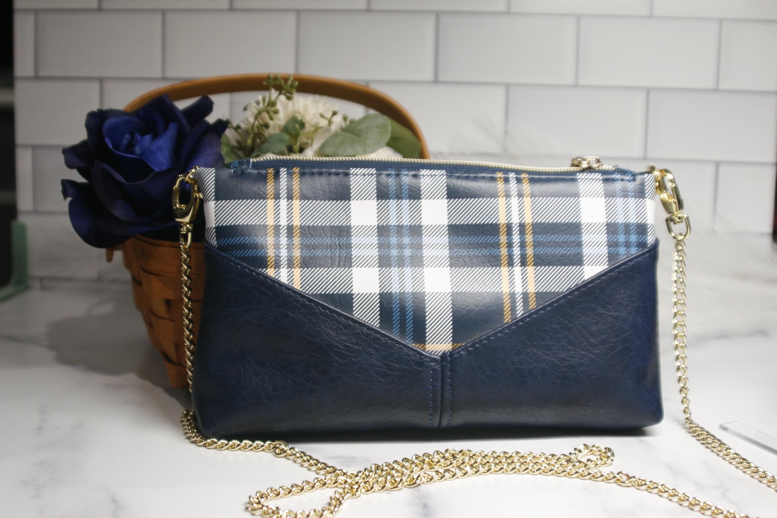 The blue and yellow tartan plaid Harlequin pouch is the perfect small purse. Includes an interior zipper pocket and two slip pockets. It is 9" x 7" x 2" with a gold chain strap.