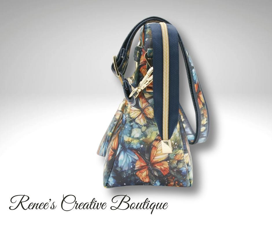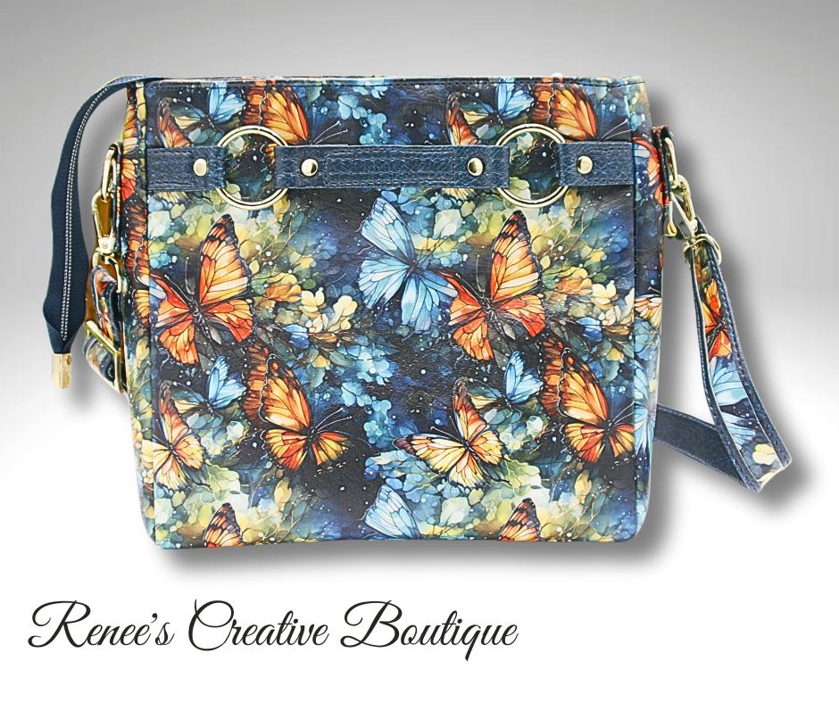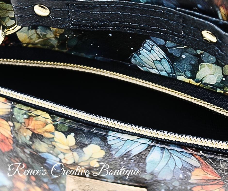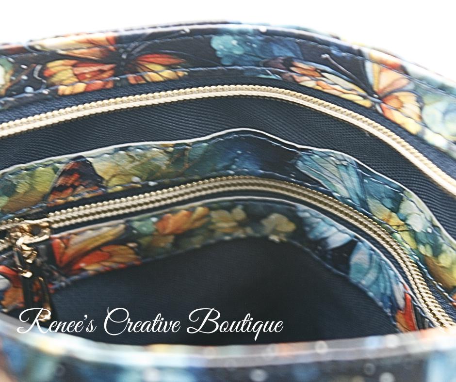 This stunning Momexa crossbody is designed with a Watercolor Butterfly vinyl exterior and a navy blue water resistant canvas interior. This bag comes with and interior and exterior zippered pocket with two slip pockets on the interior as well. All three zippers come with gold butterfly zipper pulls including the top zipper closure. An added decorative tassel on the front makes the bag complete. The purse comes with an adjustable strap and the bag measures 9"x 8" x 3"