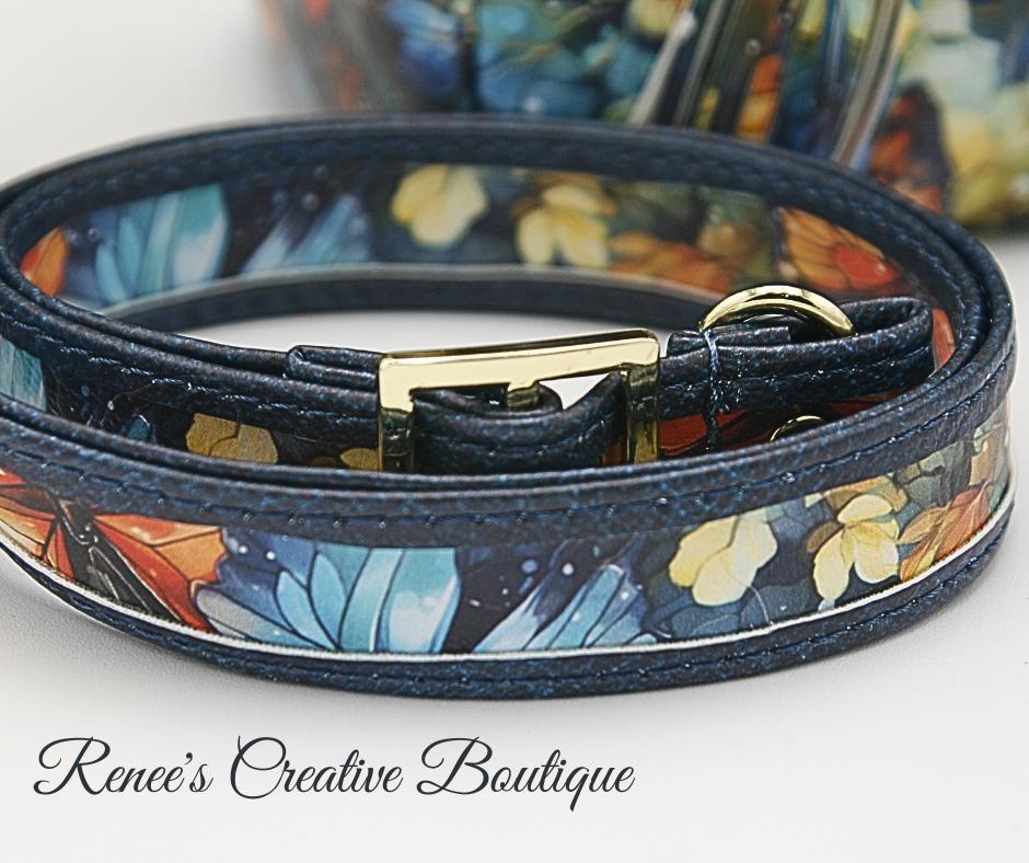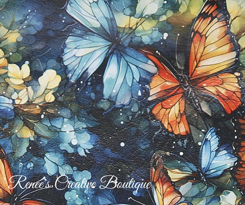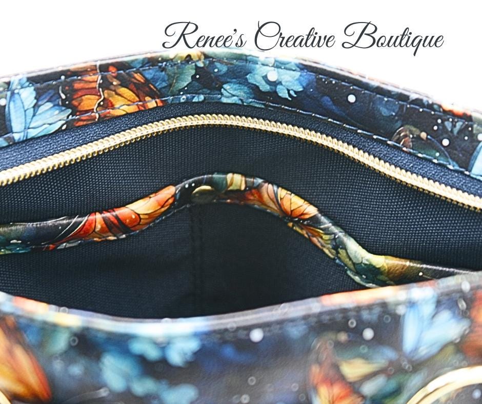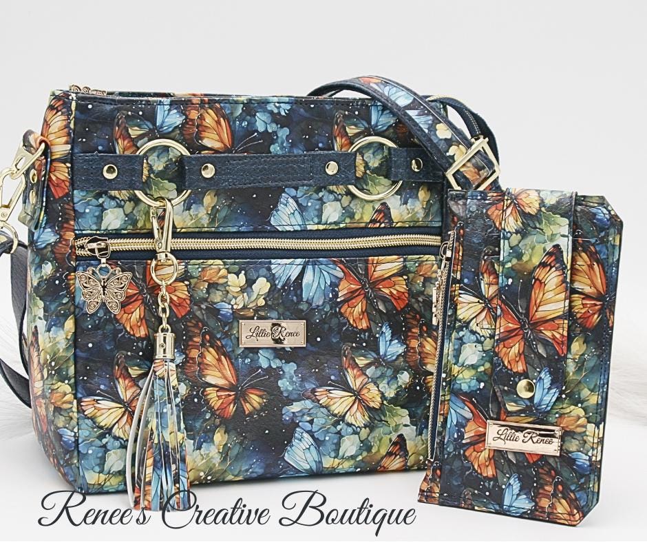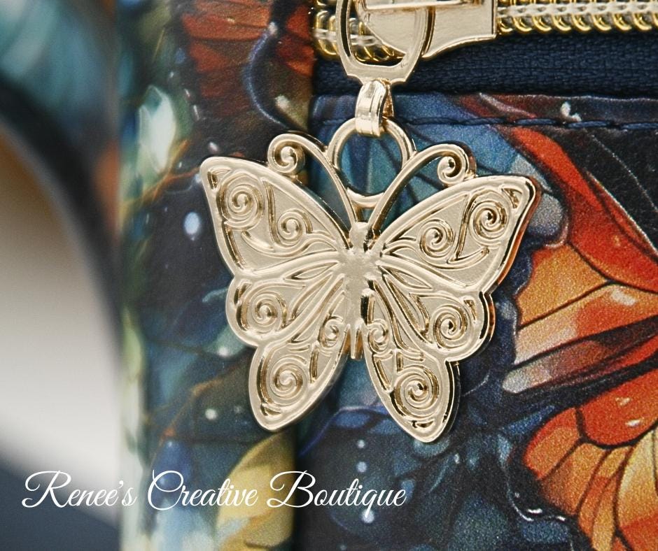 This stunning Momexa crossbody is designed with a Watercolor Butterfly vinyl exterior and a navy blue water resistant canvas interior. This bag comes with and interior and exterior zippered pocket with two slip pockets on the interior as well. All three zippers come with gold butterfly zipper pulls including the top zipper closure. An added decorative tassel on the front makes the bag complete. The purse comes with an adjustable strap and the bag measures 9"x 8" x 3"