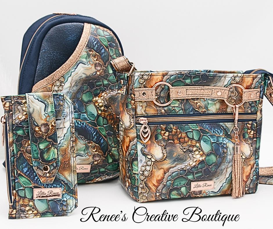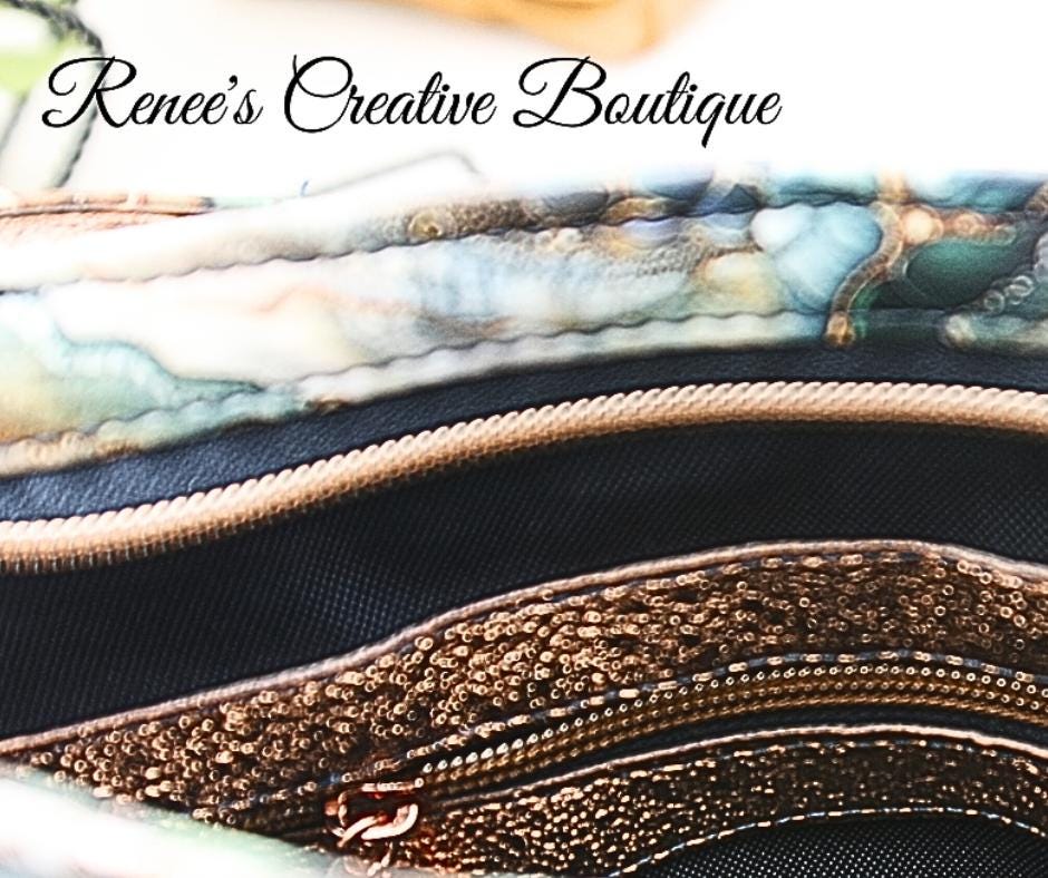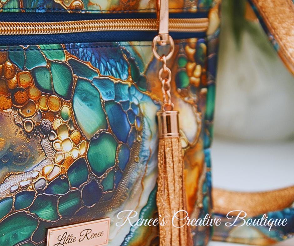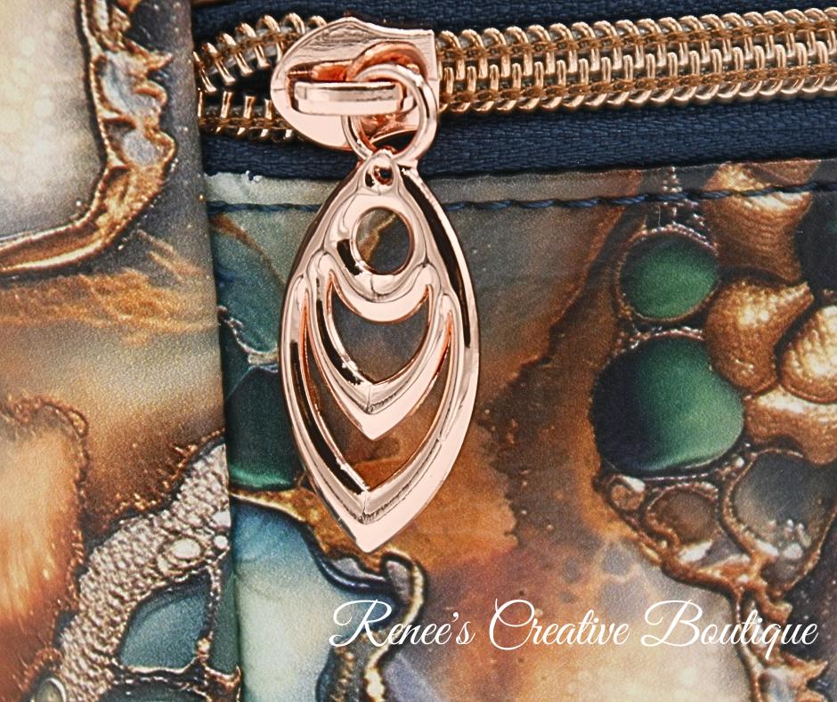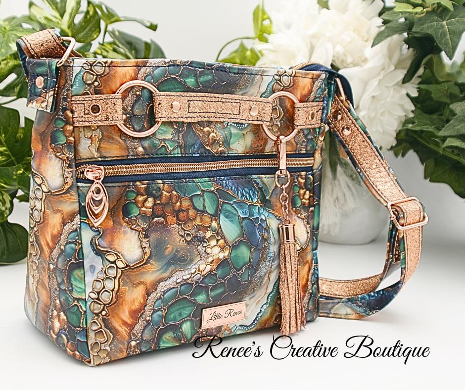 This stunning Momexa is a show stopper! Designed with beautiful vinyl exterior and water resistant canvas on the interior. It features and exterior and interior zipper and interior slip pockets. The crossbody is accented with rose gold hardware and an adjustable strap. The bag is 9" x 8" x 3". Matching slim wallet sold separately.