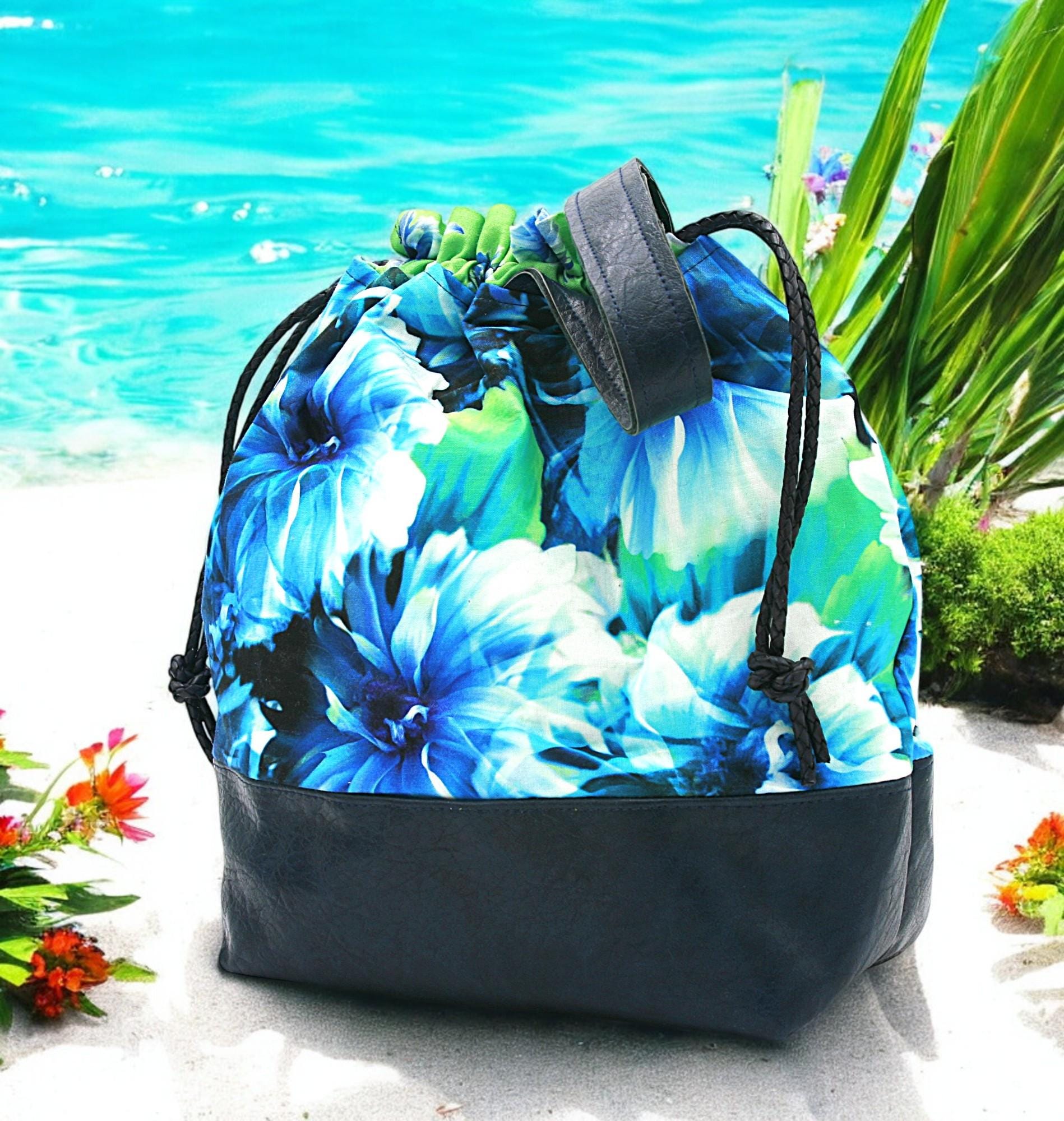 The Floral Bloom Drawstring Bucket Bag is a perfect blend of functionality and floral elegance, making it an essential addition to any wardrobe. Crafted from beautiful blue and green floral cotton woven fabric, accented with luxurious navy faux leather, this stylish bucket bag offers a sophisticated yet practical design that transitions effortlessly from work to weekend.