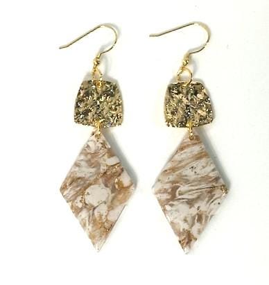 Add timeless sophistication to your look with these Ivory and Gold Diamond Polymer Clay Earrings. Crafted by hand, each pair features a stunning diamond-shaped ivory clay design accented with shimmering gold details and finished with sleek gold connectors. At 3 inches in length, these earrings offer the perfect balance of bold and elegant—lightweight, stylish, and effortlessly chic.