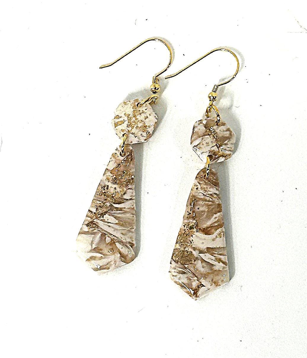 These Ivory and Gold Drop Polymer Clay Earrings feature a soft pearlescent ivory base accented with subtle gold marbling. Hanging gracefully from gold-plated wire hooks, they measure 2½ inches long, creating a chic, lightweight design that complements both casual and dressy looks.