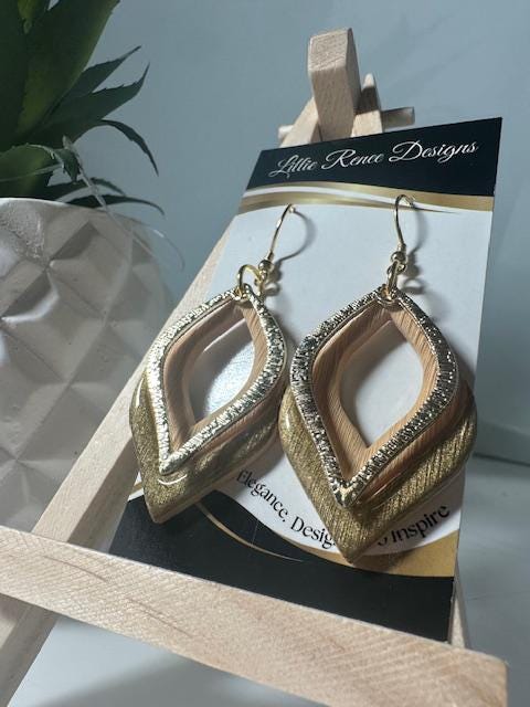 Bright, bold, and beautifully handmade, these mustard yellow polymer clay earrings are designed in a pointed teardrop donut shape accented with a shimmering stripe of gold. Each earring is finished with a coordinating pointed teardrop brushed gold-plated component and secure gold-plated ear wires for a chic, modern look. Measuring 2 1/4" in length, these lightweight earrings add a perfect pop of color and metallic shine to any outfit. Ideal for everyday wear, seasonal style, or a thoughtful handmade gift.