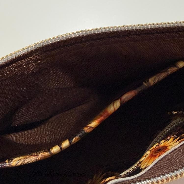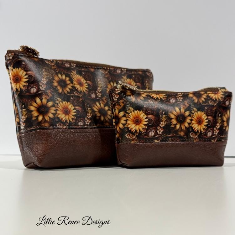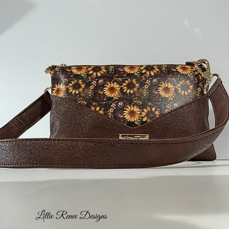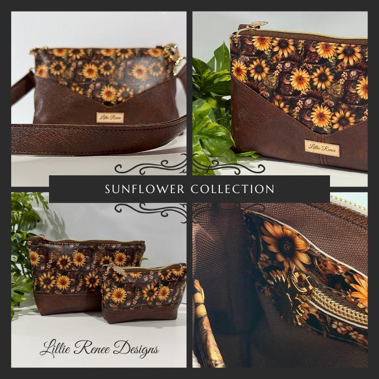 Each piece in this collection is accented with rich brown faux leather, elegant gold hardware, and charming sunflower zipper pulls that add a unique and playful finishing touch. The warm sunflower tones paired with the classic harlequin pattern create a bold yet timeless look that pairs beautifully with everyday outfits.